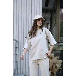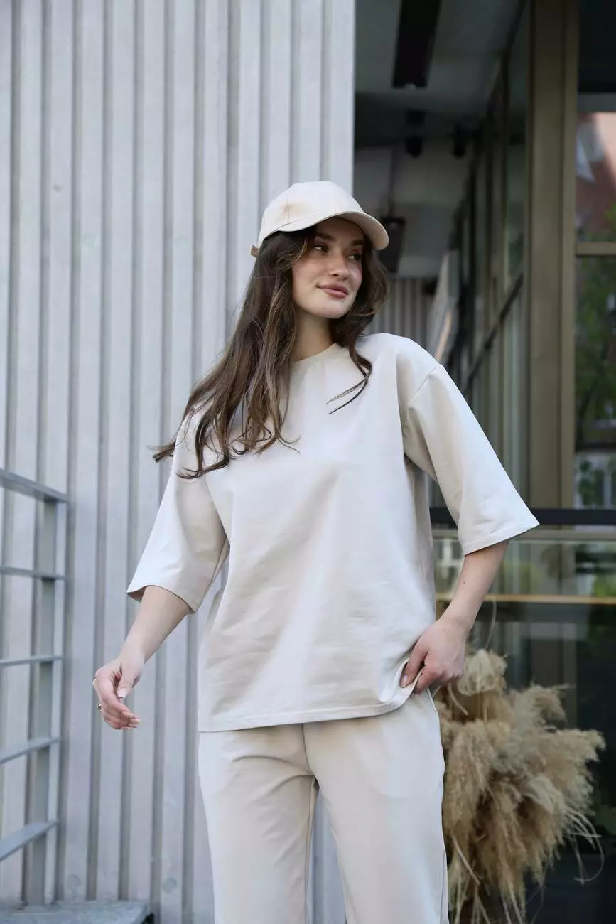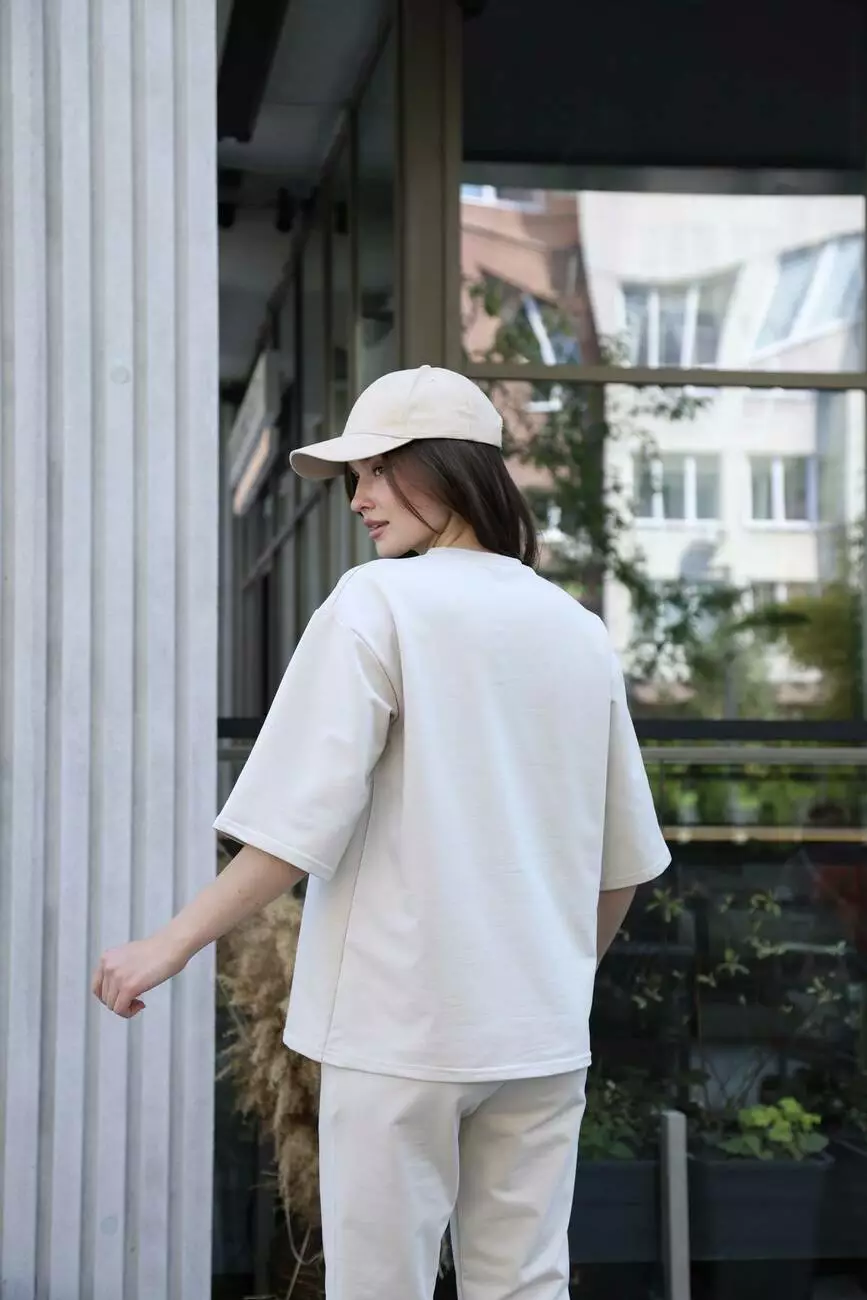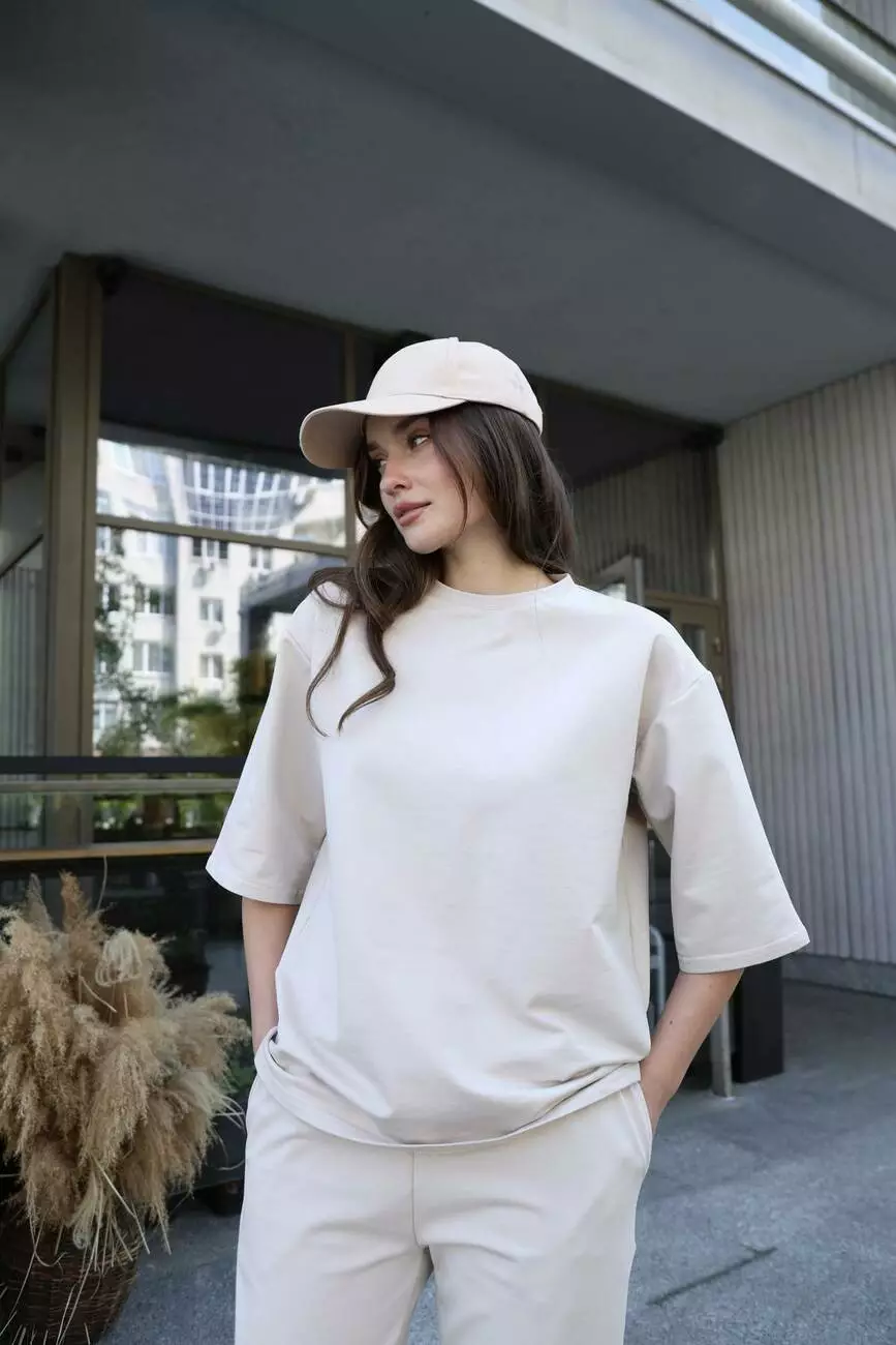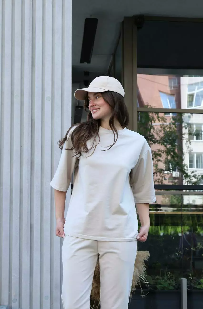 Футболка — оверсайз-крою з короткими рукавами, круглою горловиною та зручною посадкою.