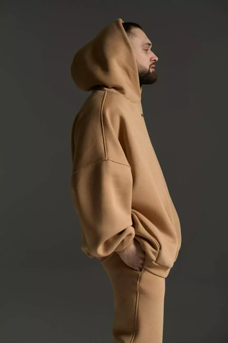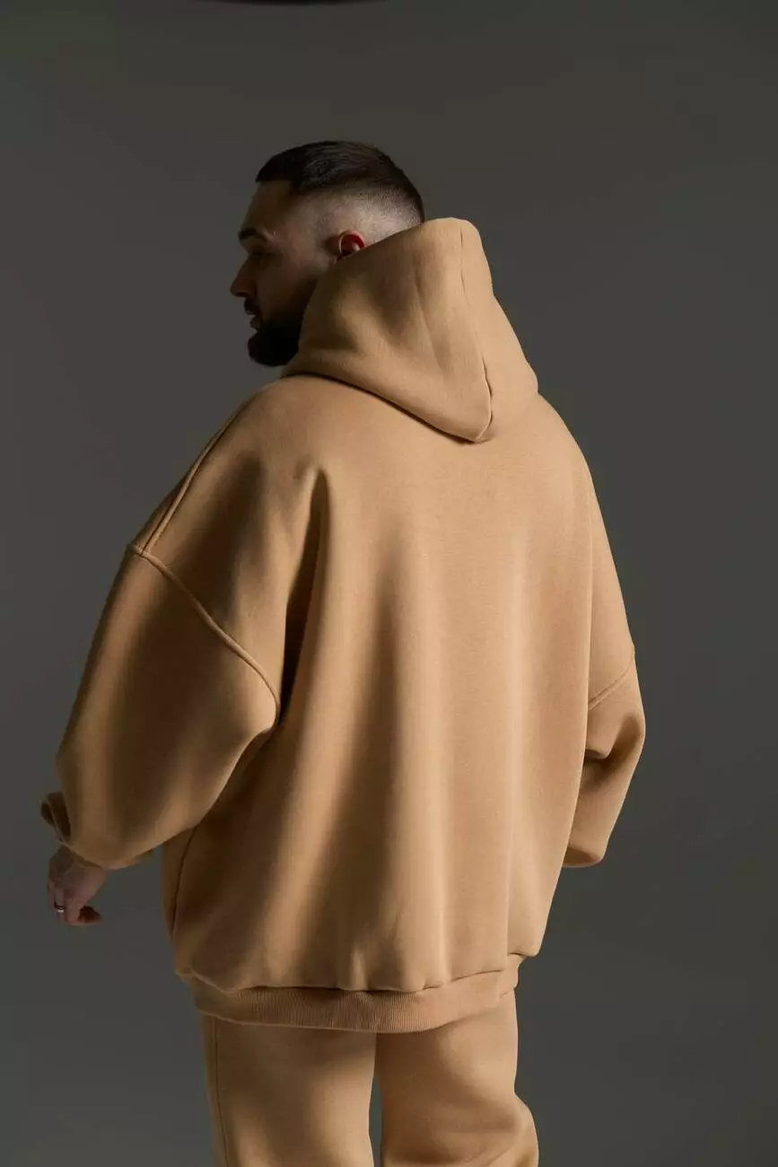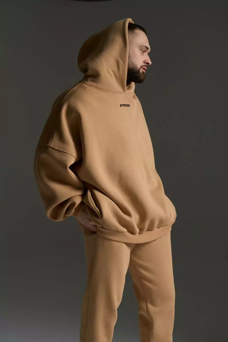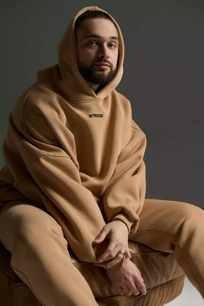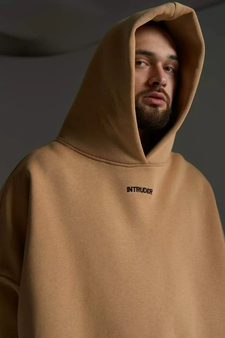 - Вільна модель із заниженою лінією плеча та подвійним, глибоким капюшоном;