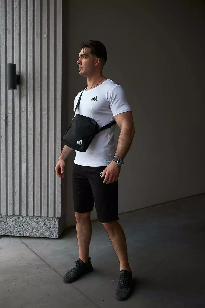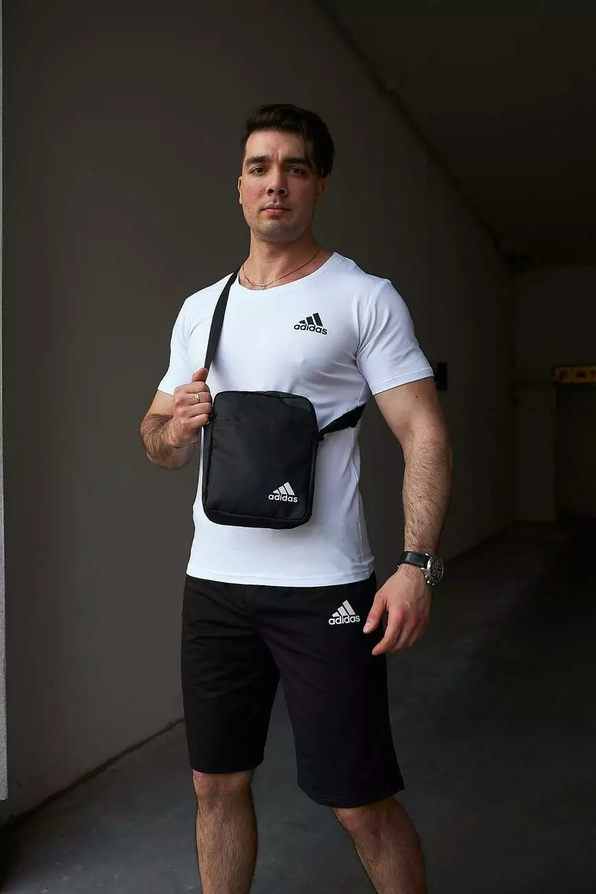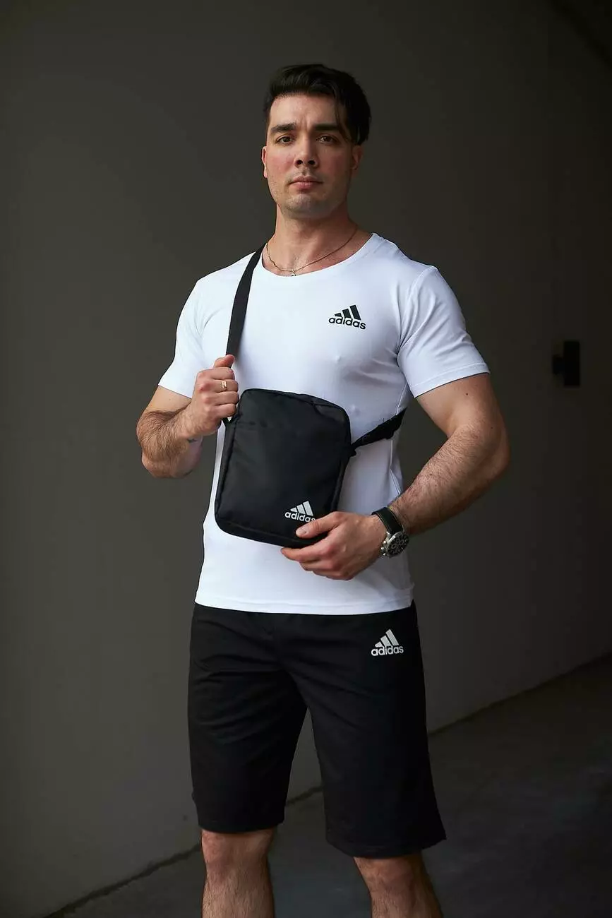 Комплект чоловічий Adidas: футболка біла + шорти чорні + барсетка чорна