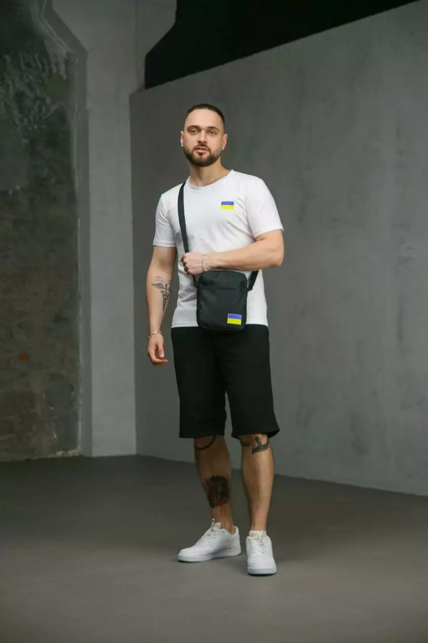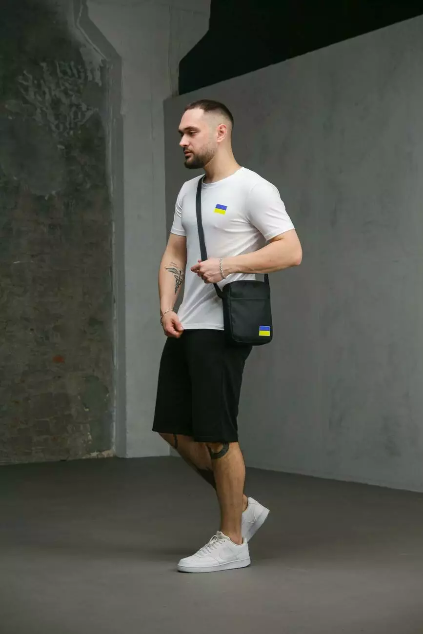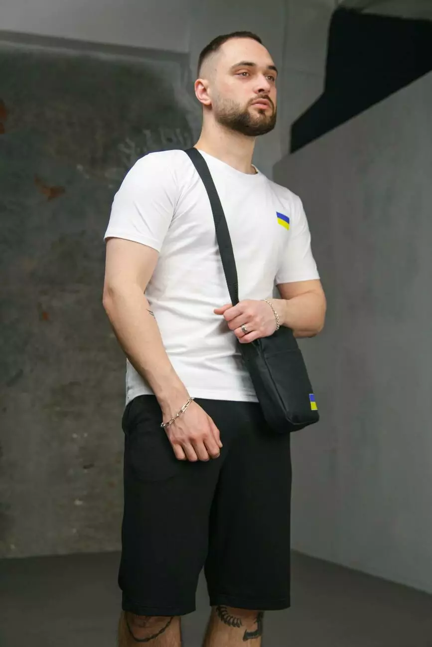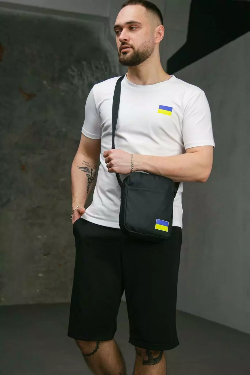 Комплект чоловічий Intruder: футболка з прапором на грудях біла + шорти трикотажні чорні + барсетка "UA" чорна