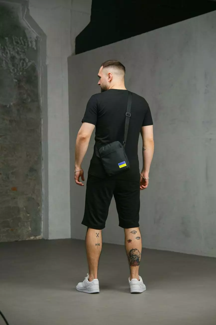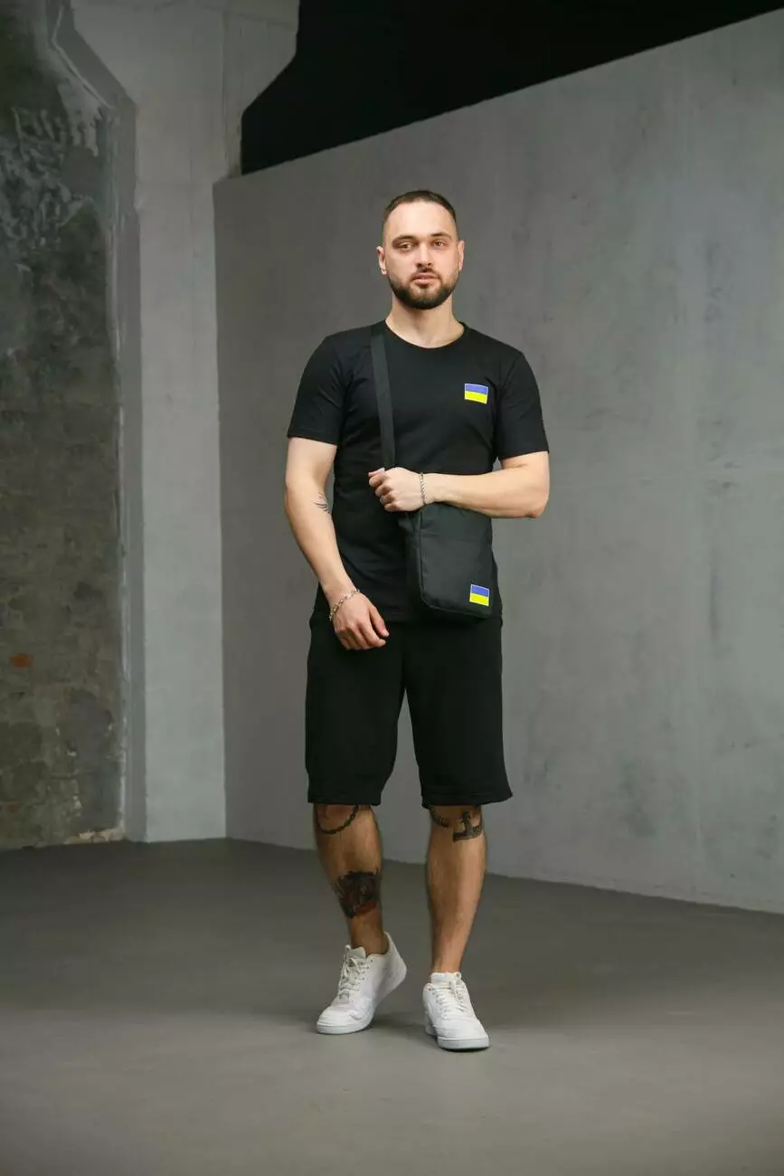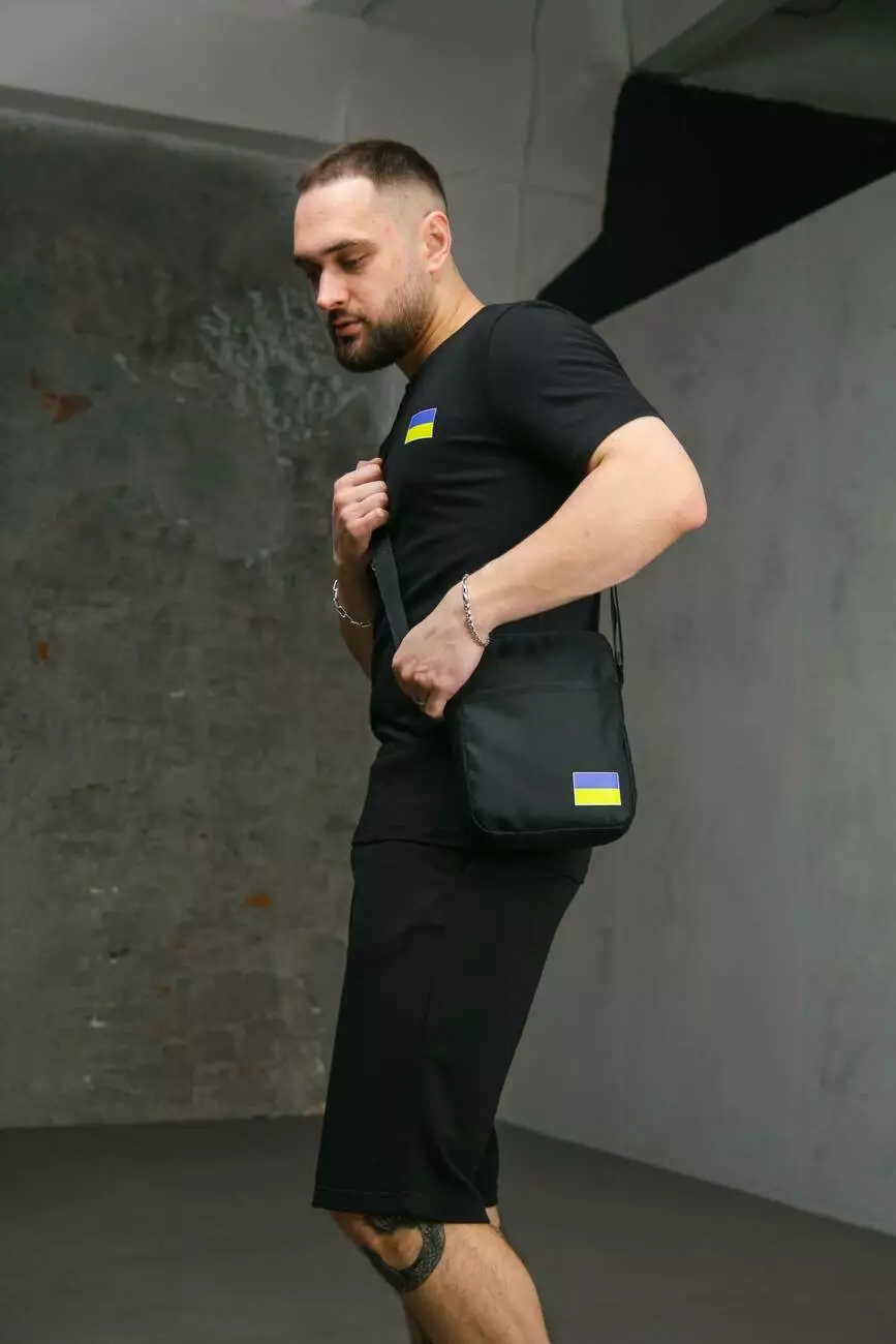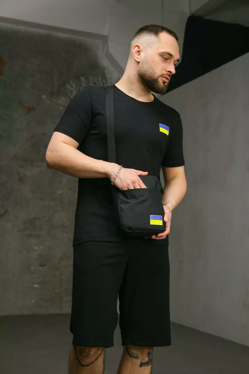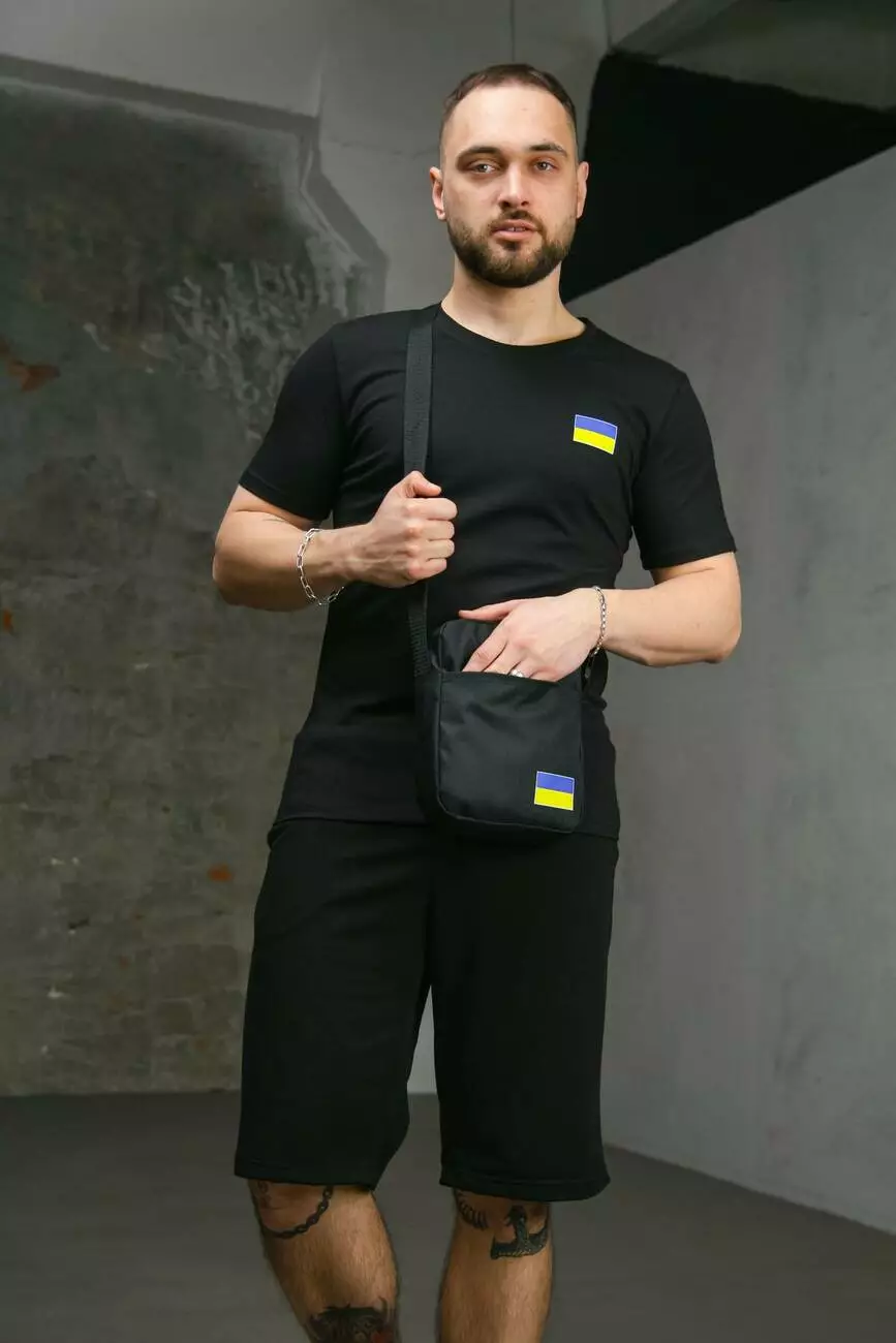 Комплект чоловічий Intruder: футболка з прапором на грудях чорна + шорти трикотажні чорні + барсетка "UA" чорна
