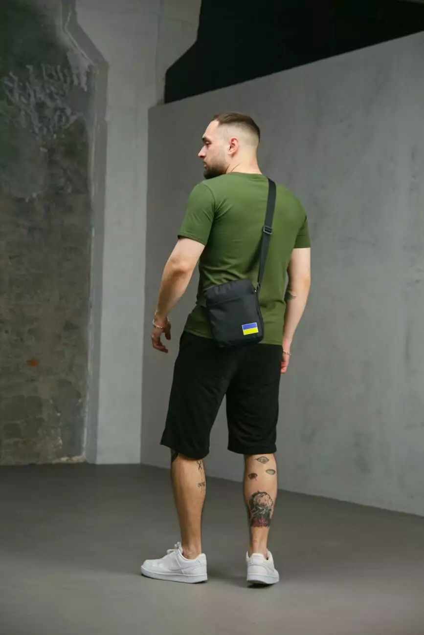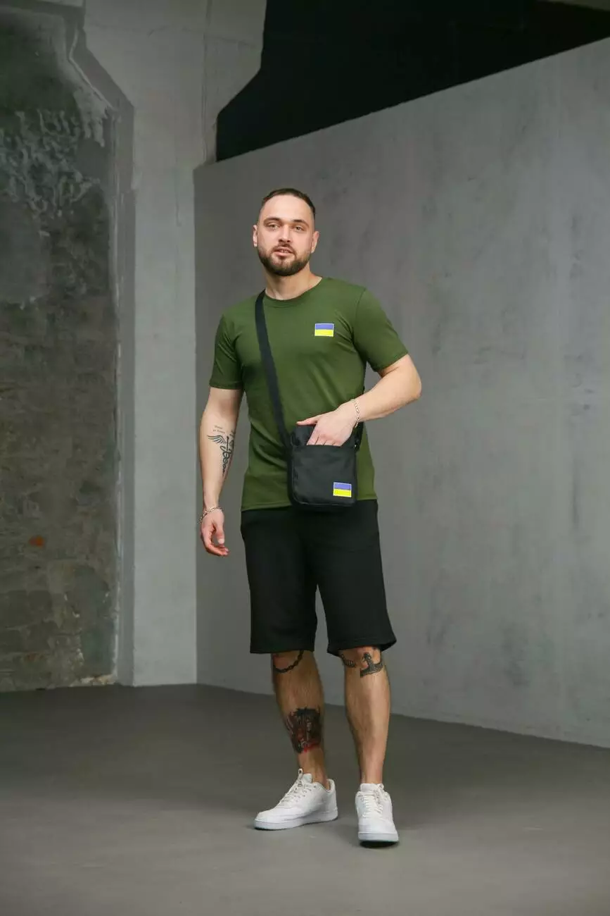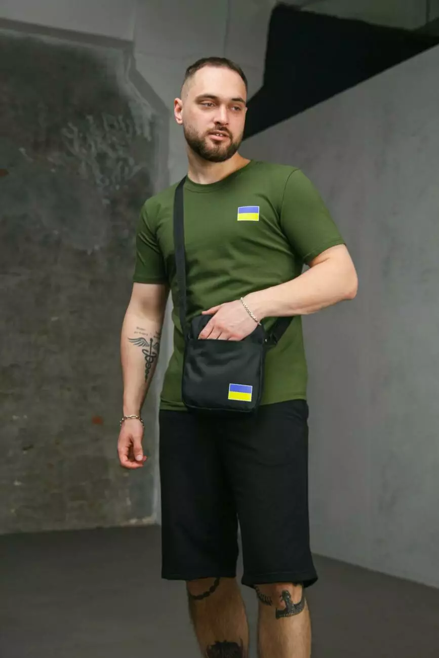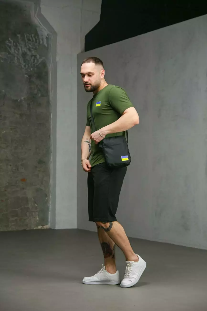 Комплект чоловічий Intruder: футболка з прапором на грудях хакі + шорти трикотажні чорні + барсетка "UA" чорна