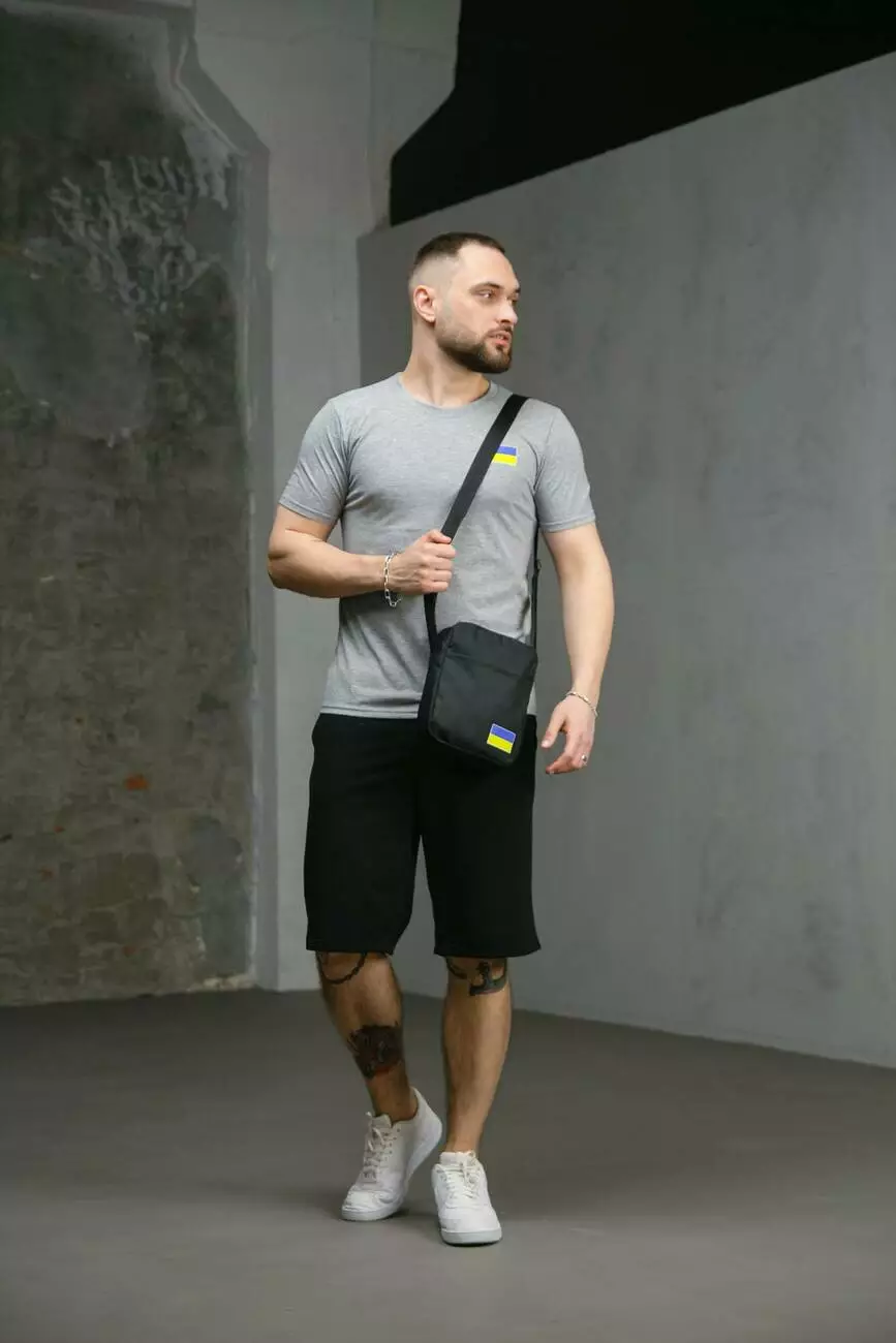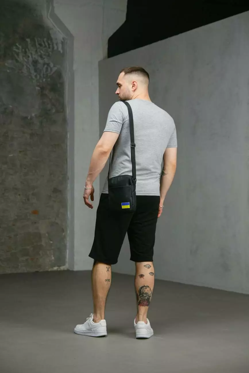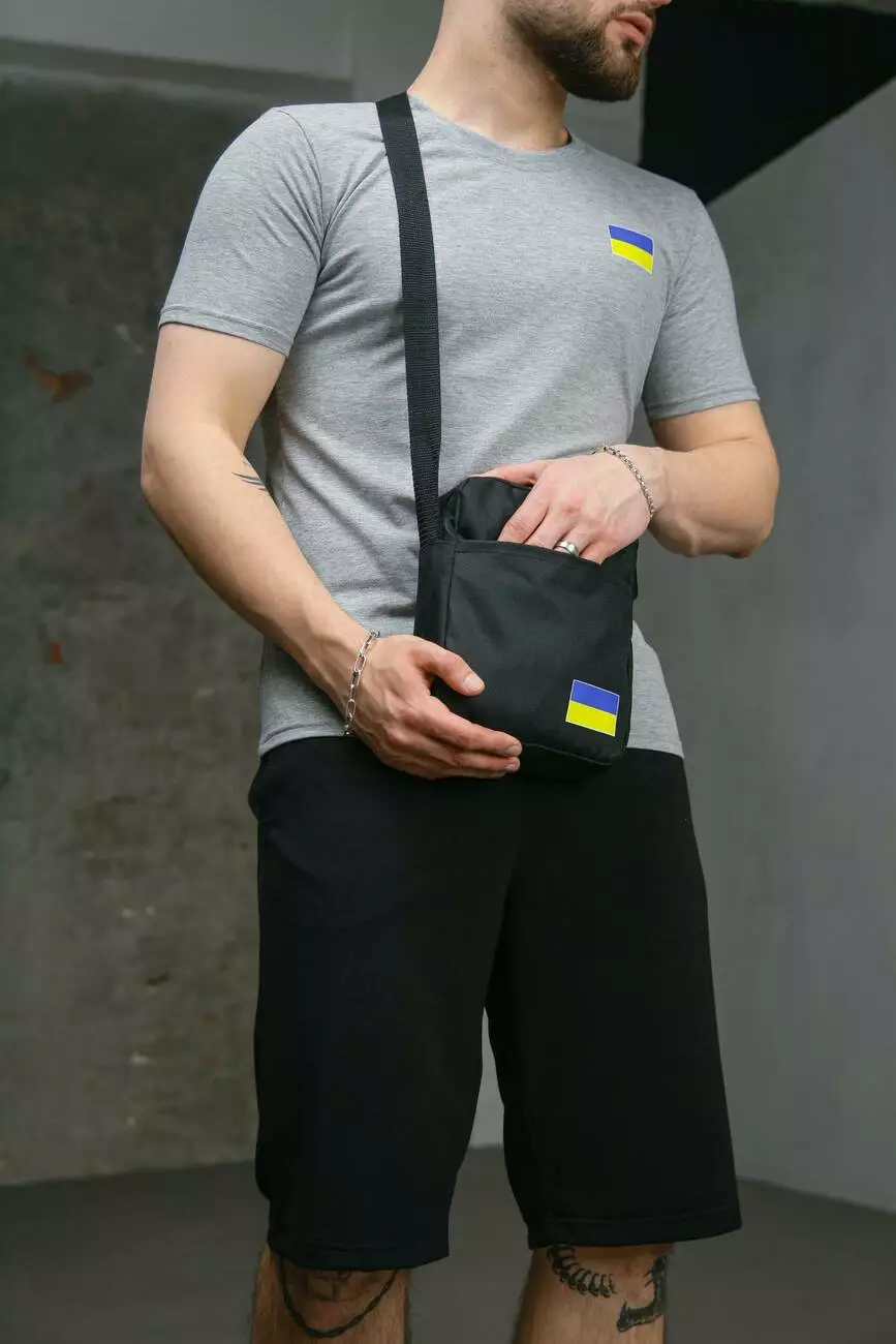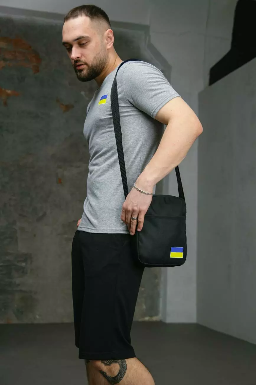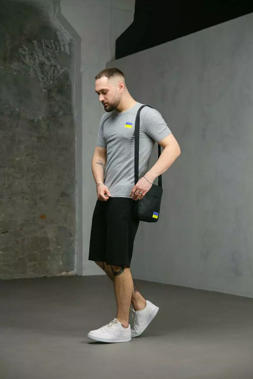 Комплект чоловічий Intruder: футболка з прапором на грудях сіра + шорти трикотажні чорні + барсетка "UA" чорна