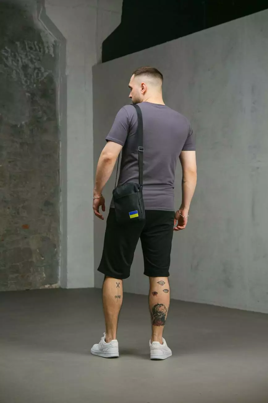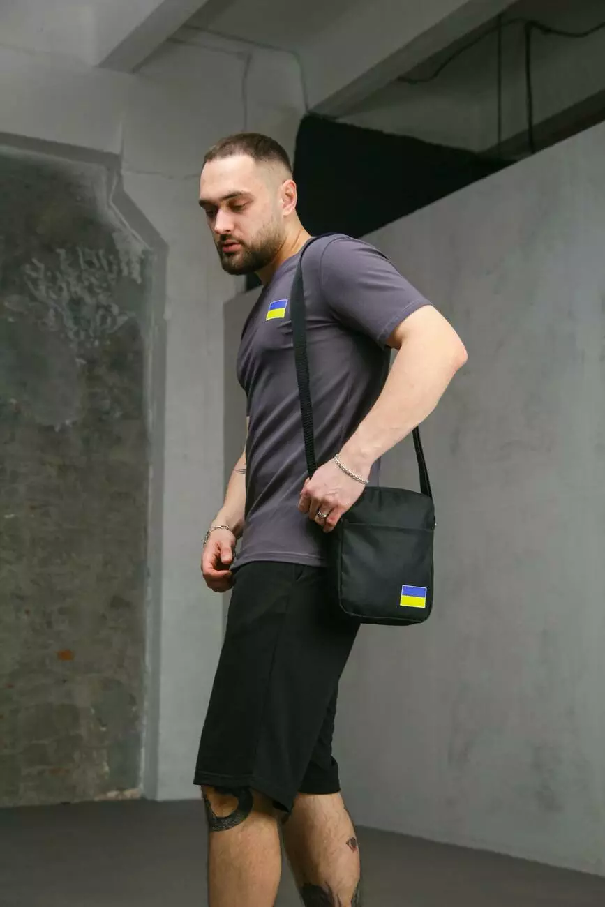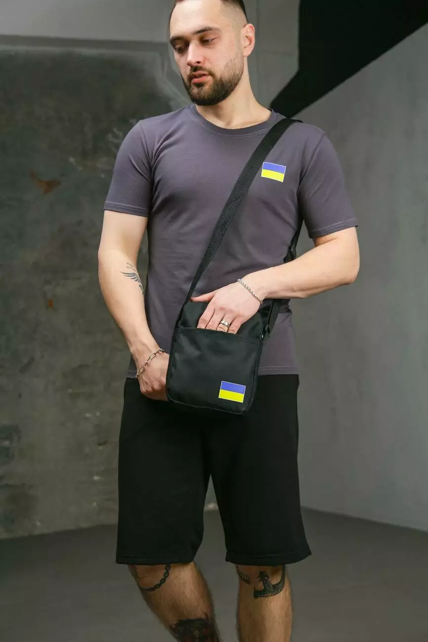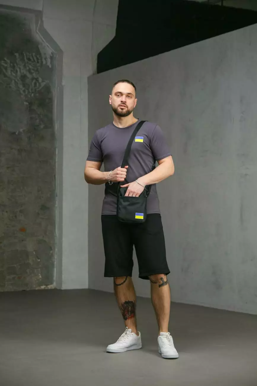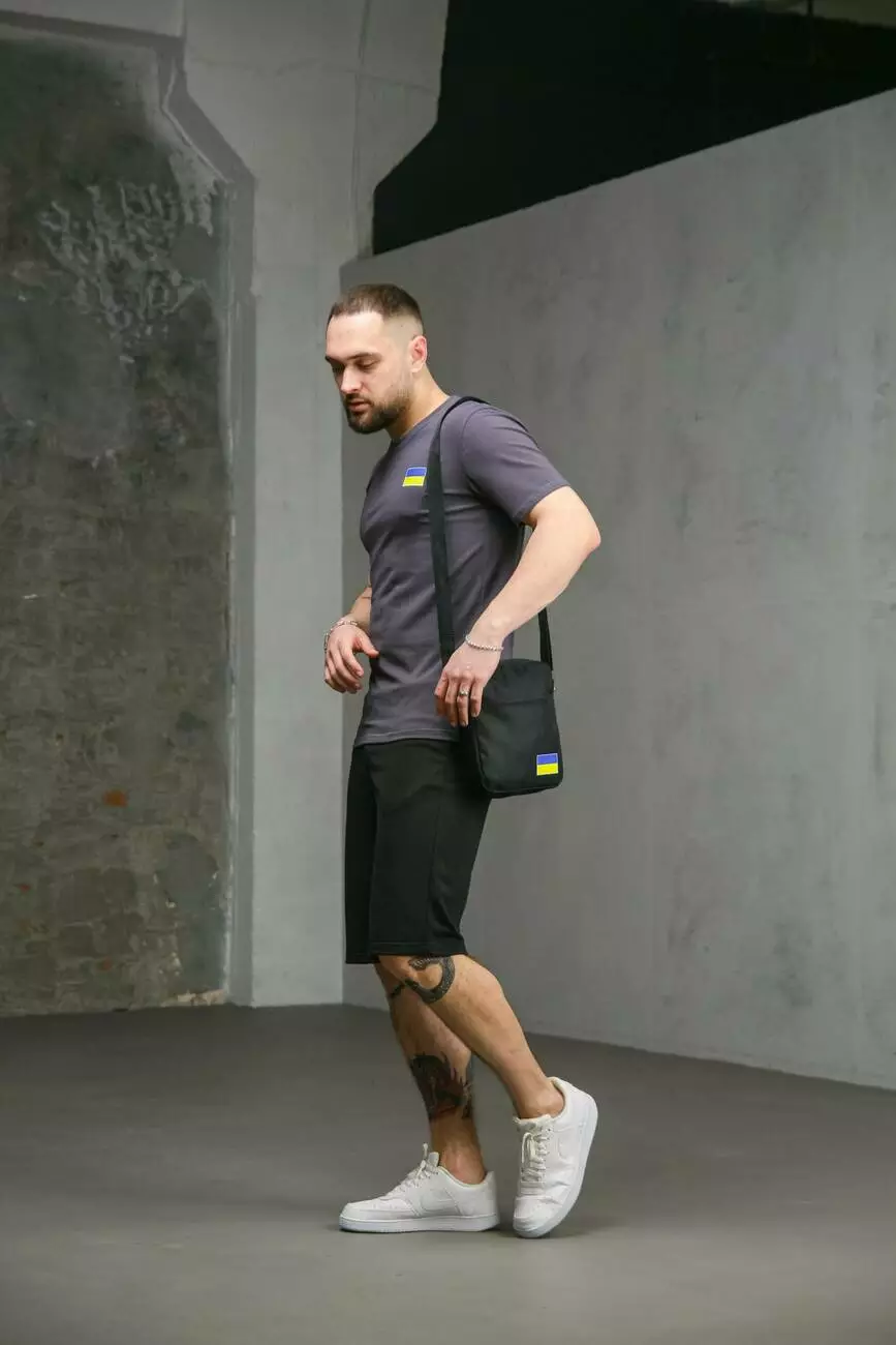 Комплект чоловічий Intruder: футболка з прапором на грудях темно-сіра + шорти трикотажні чорні + барсетка "UA" чорна