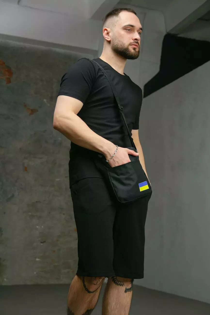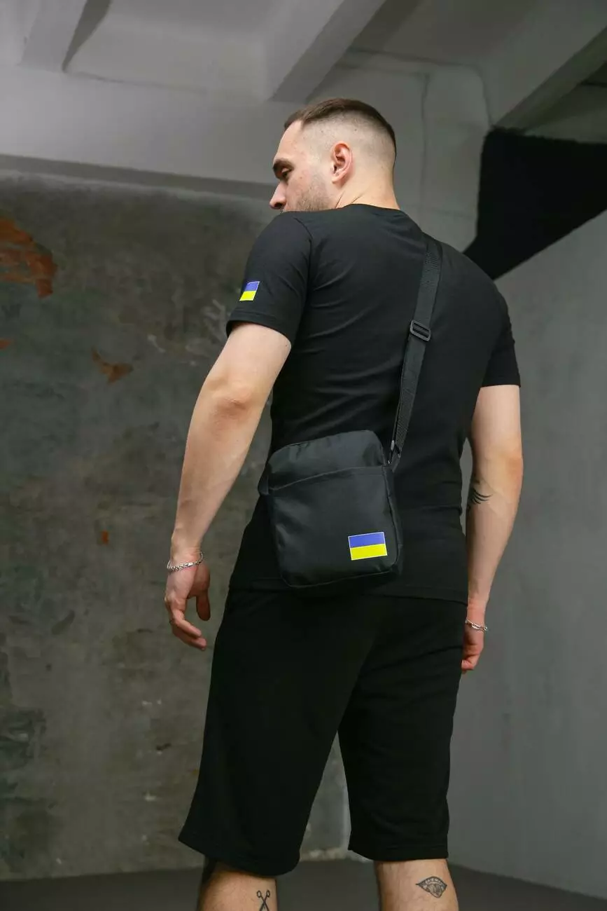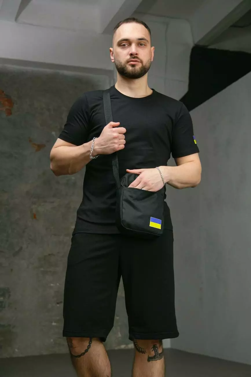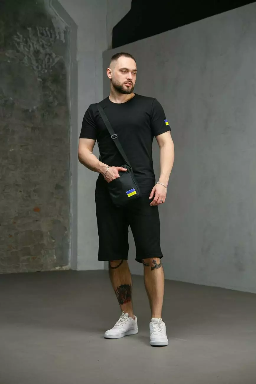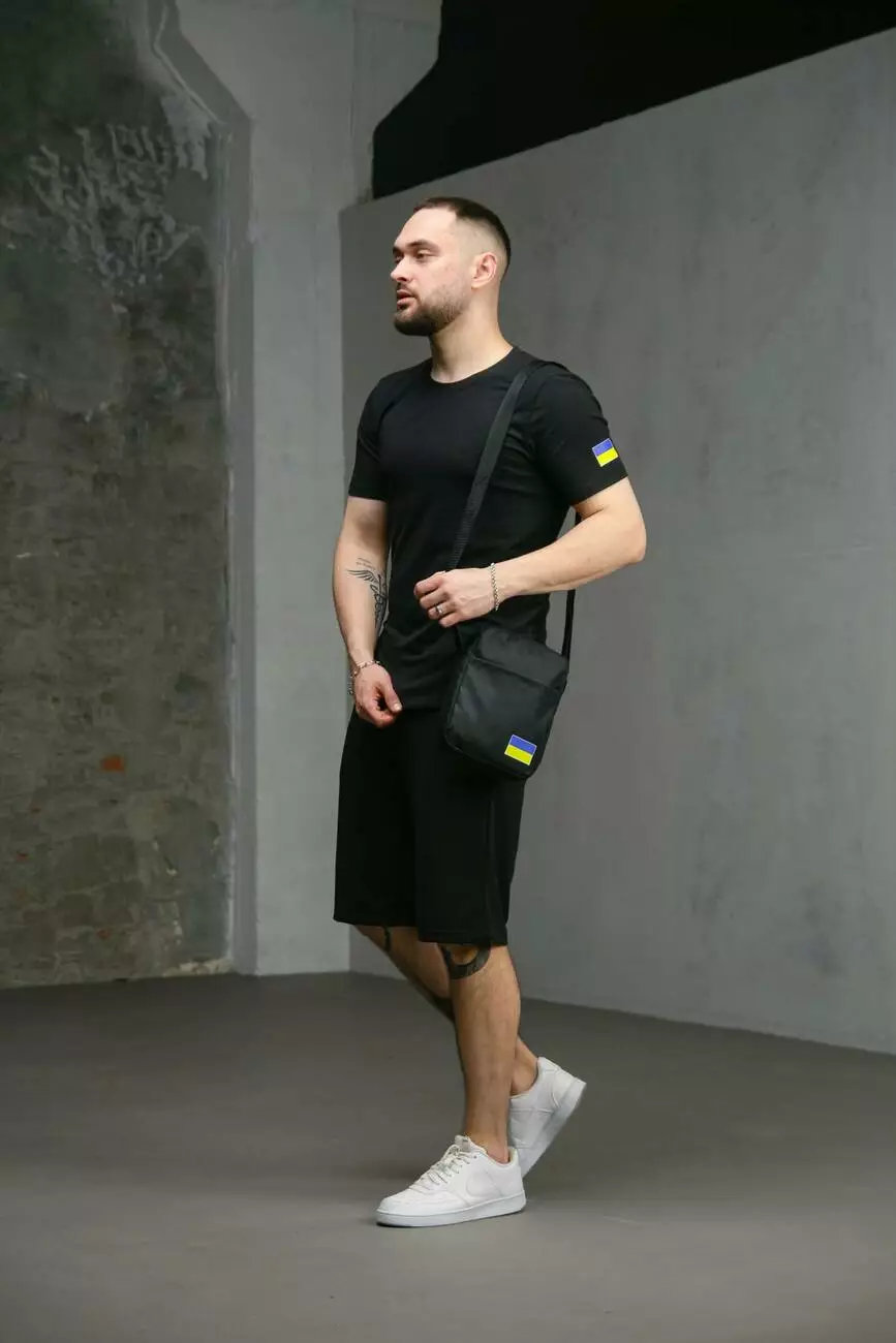 Комплект чоловічий Intruder: футболка з прапором на плечі чорна + шорти трикотажні чорні + барсетка "UA" чорна