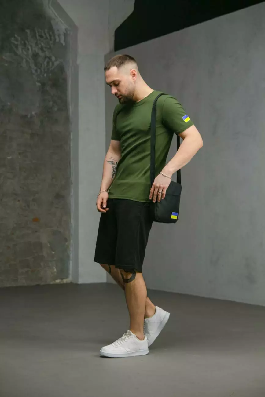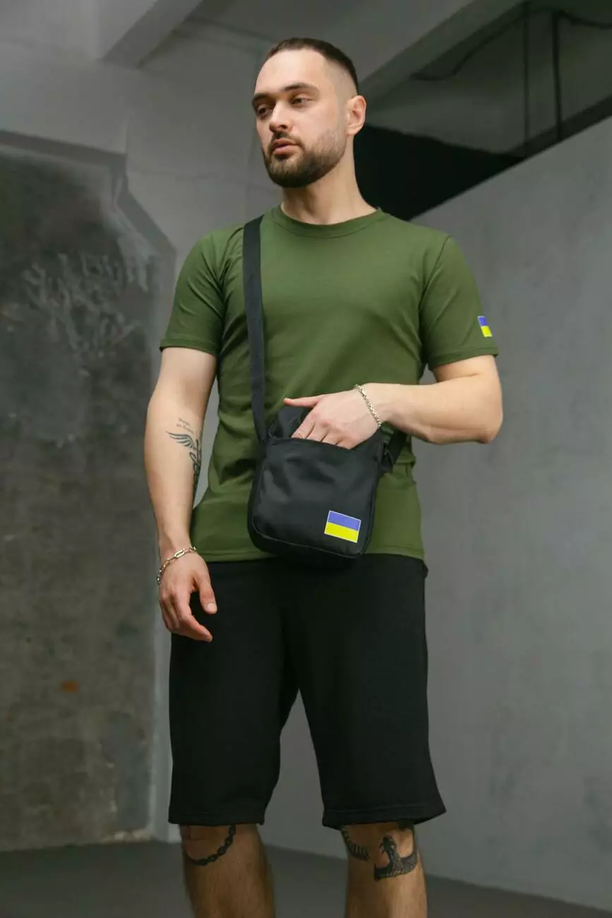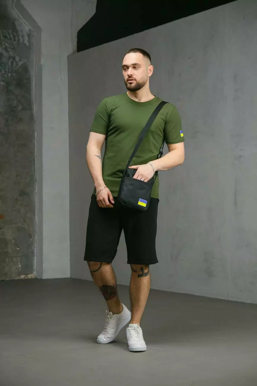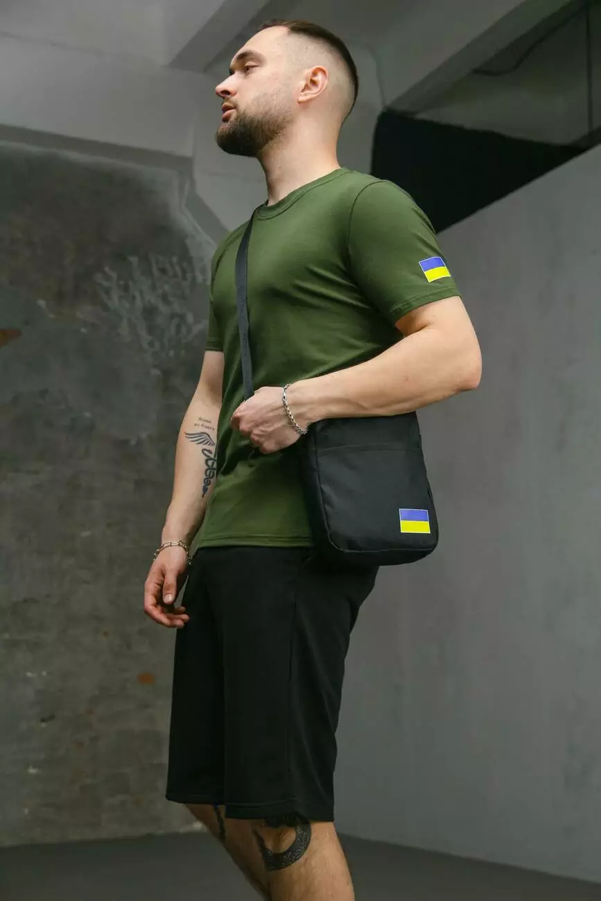 Комплект чоловічий Intruder: футболка з прапором на плечі хакі + шорти трикотажні чорні + барсетка "UA" чорна