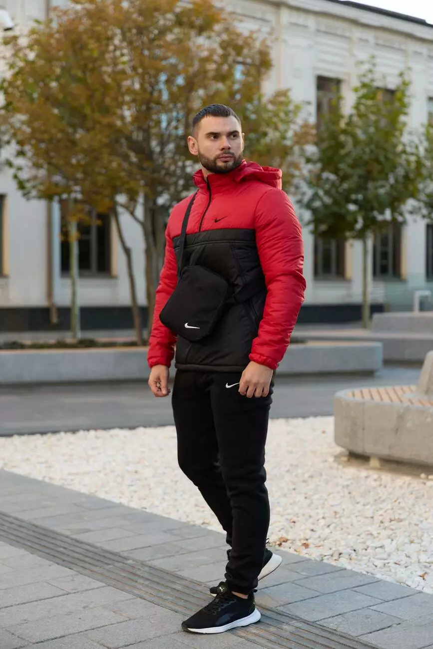 Комплект чоловічий Nike: анорак утеплений червоно-чорний + штани з тринитки утеплені чорні. Барсетка У ПОДАРУНОК!