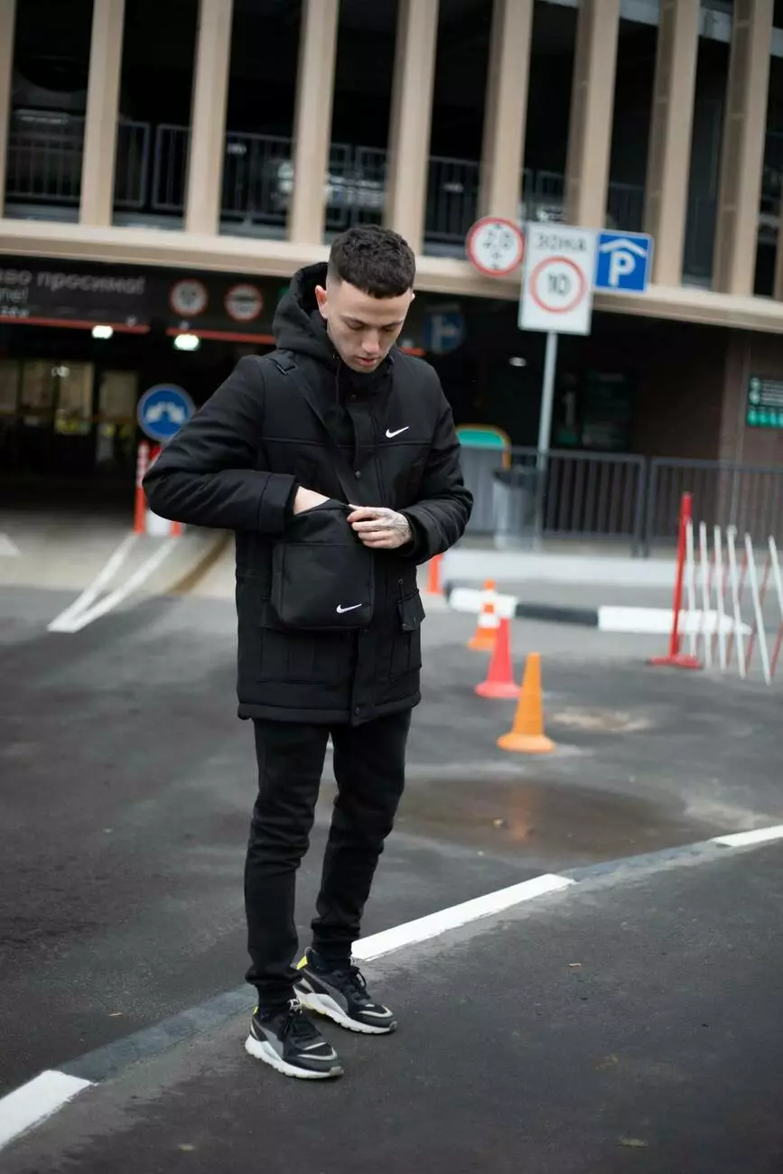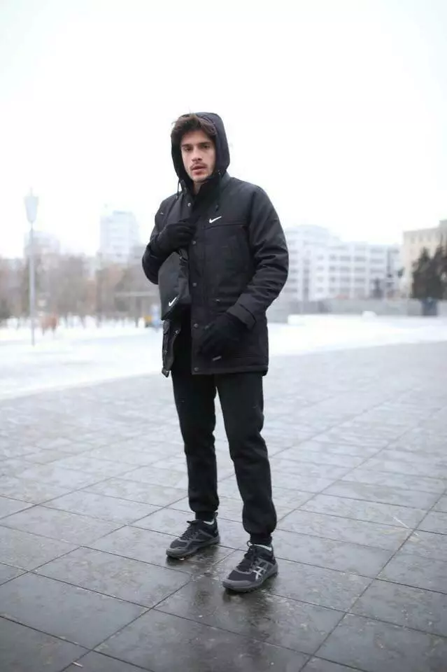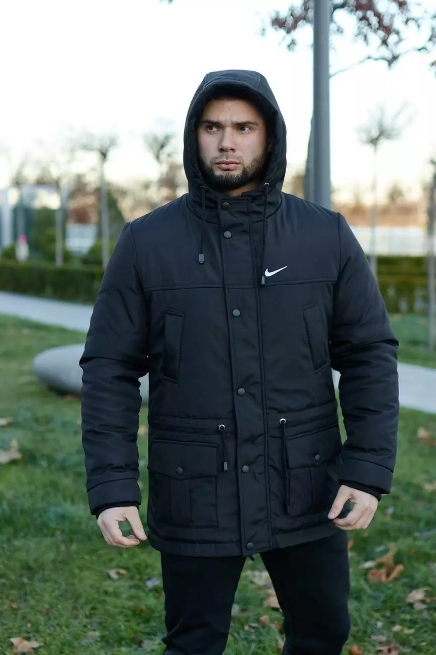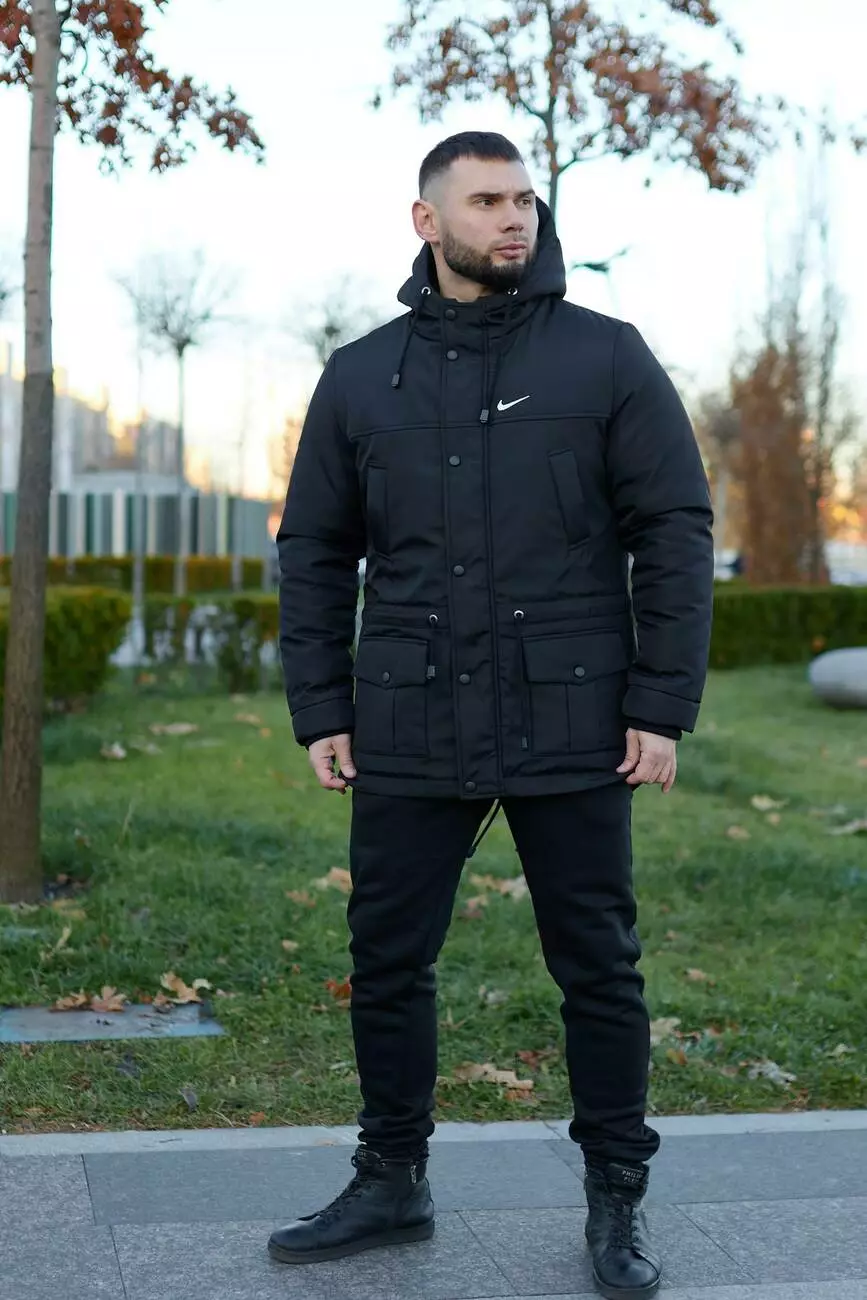 Комплект чоловічий Nike чорний: парка зимова + штани з тринитки утеплені. Барсетка та рукавички У ПОДАРУНОК!