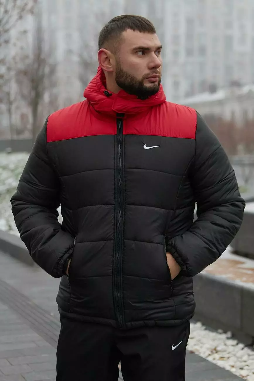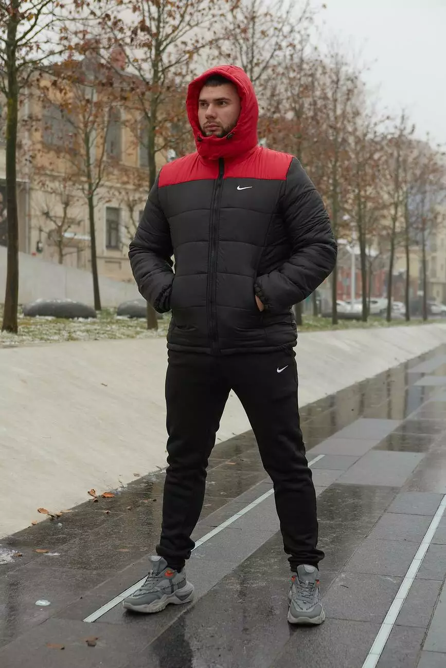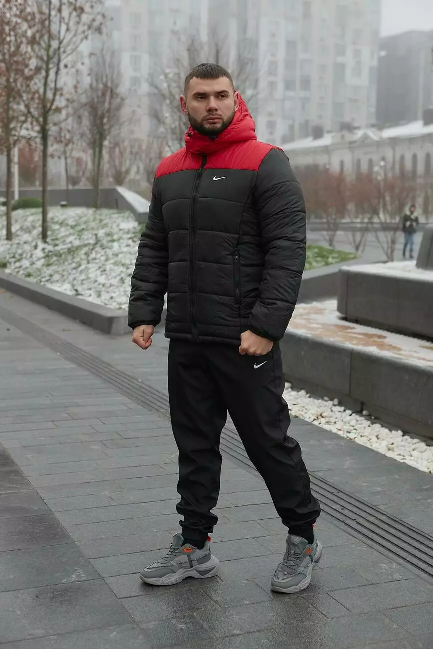 Комплект чоловічий Nike: куртка зимова "Frost" червоно-чорна + штани з тринитки утеплені чорні