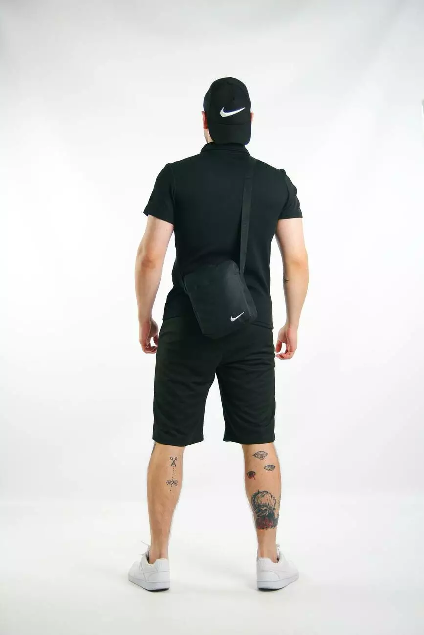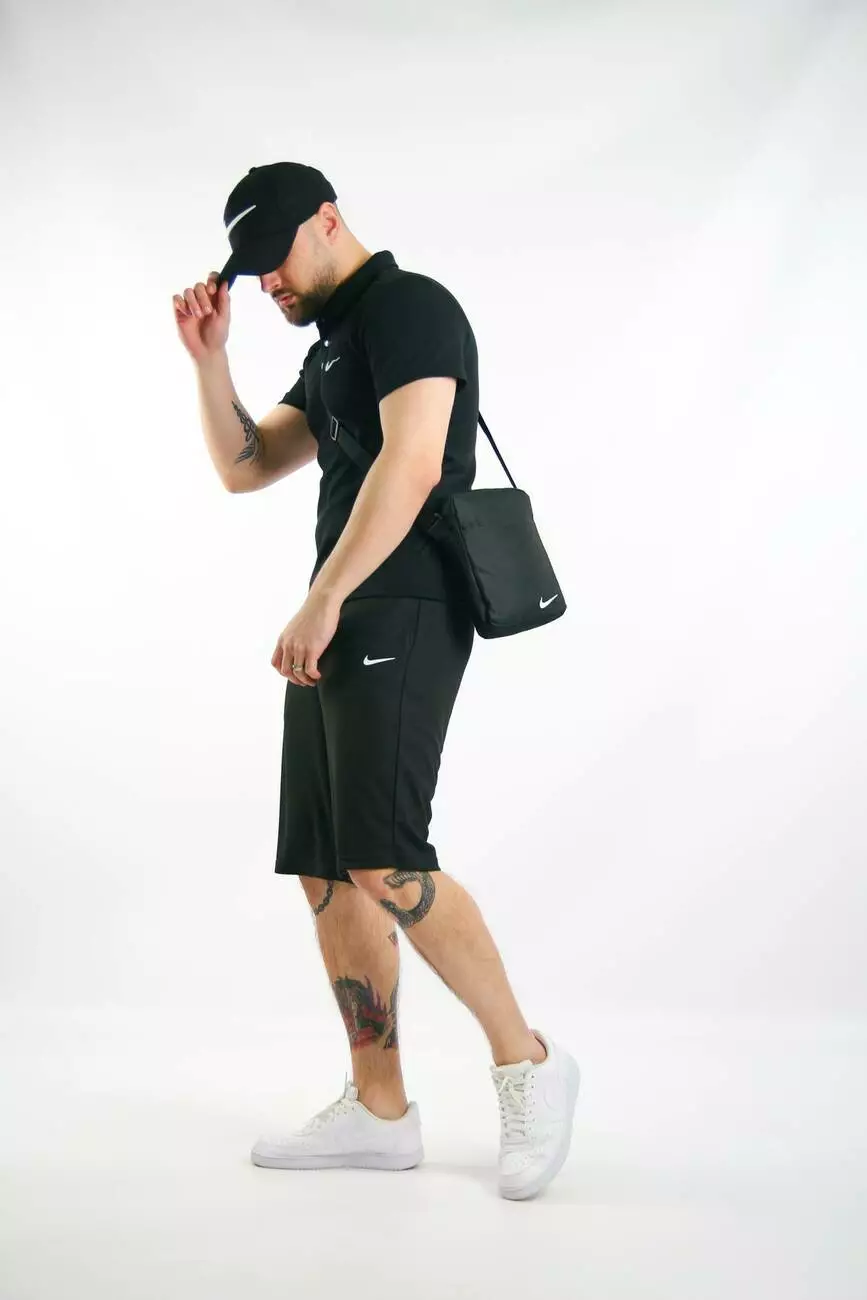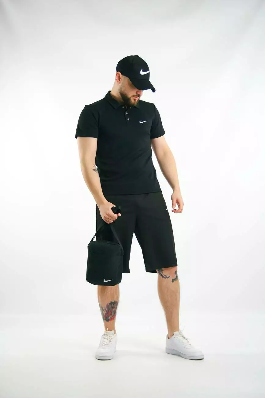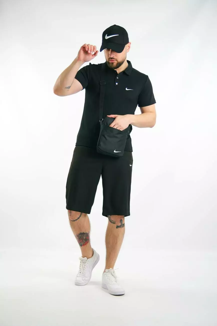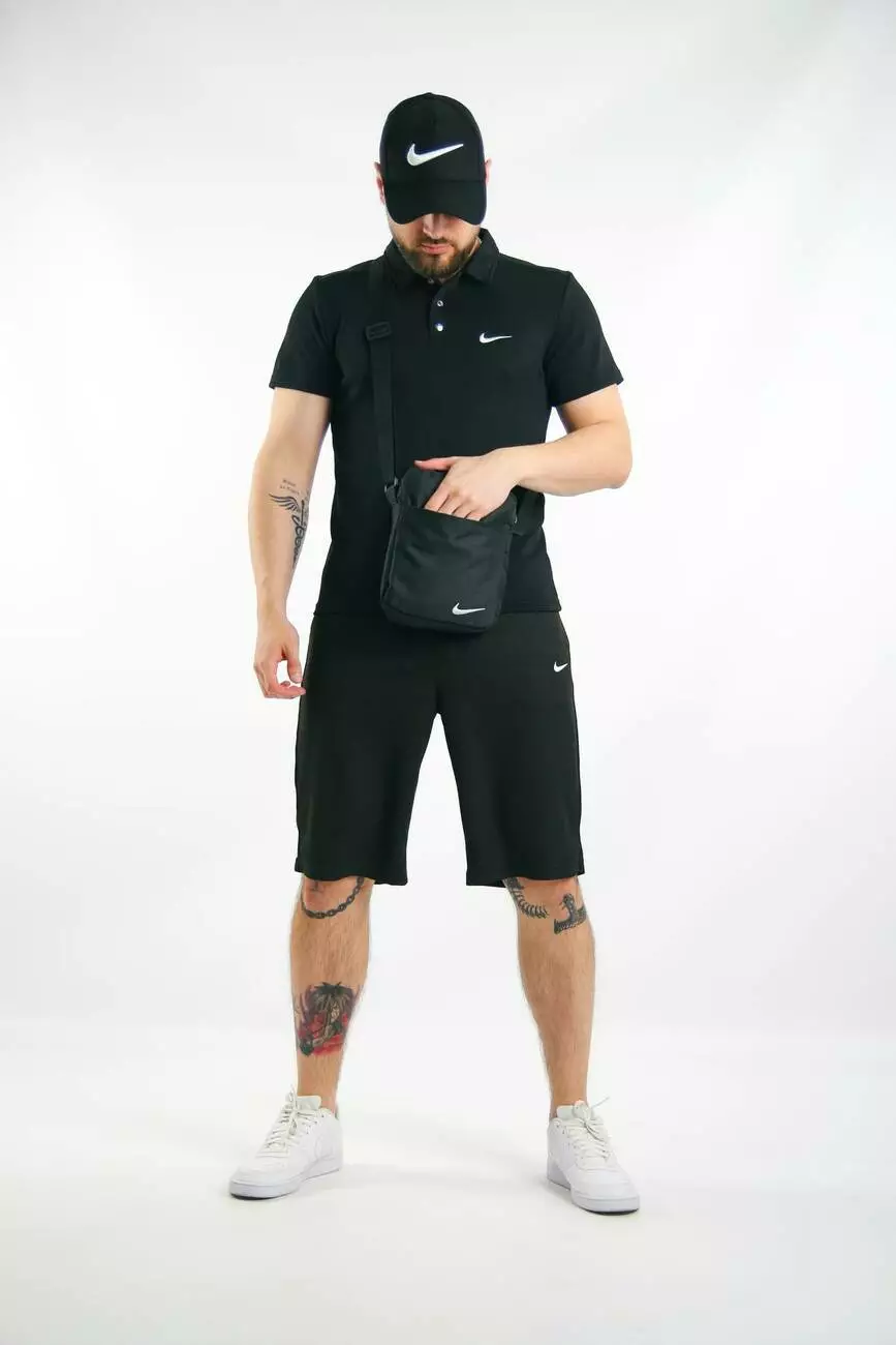 Комплект чоловічий Nike: поло чорне + шорти чорні + барсетка чорна + кепка чорна