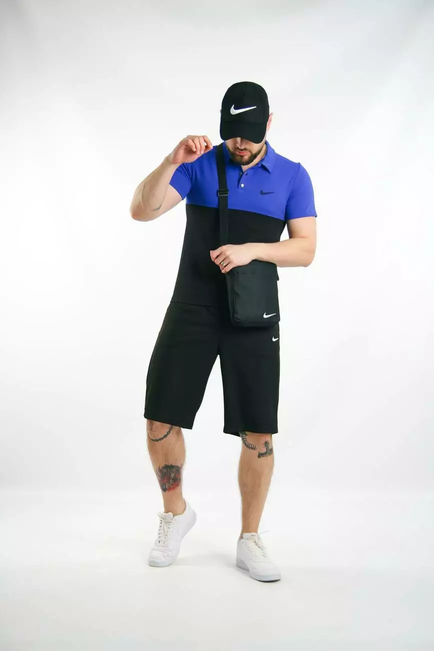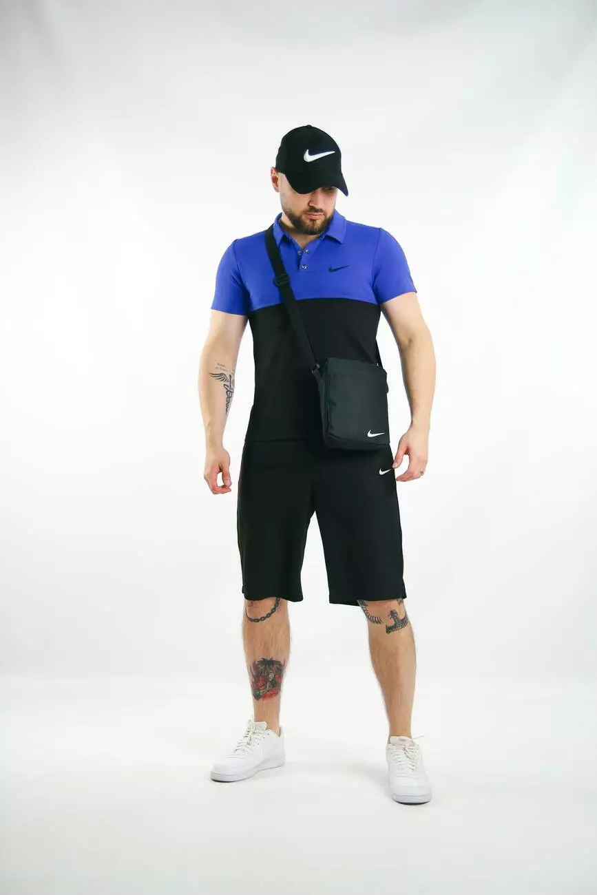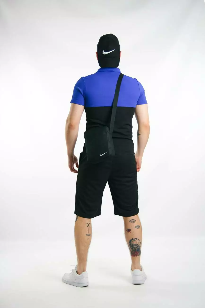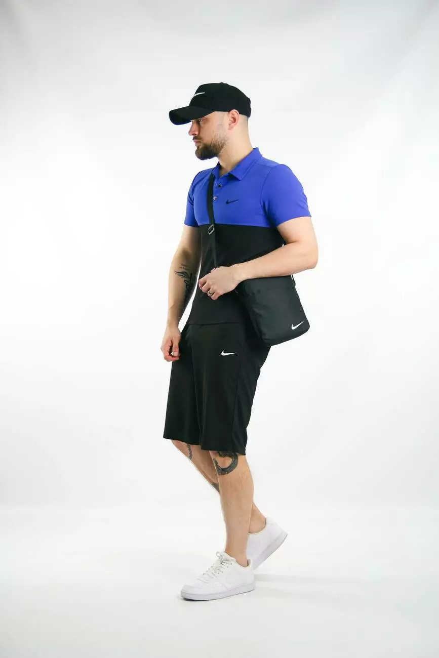 Комплект чоловічий Nike: поло електрик-чорне + шорти чорні + барсетка чорна + кепка чорна