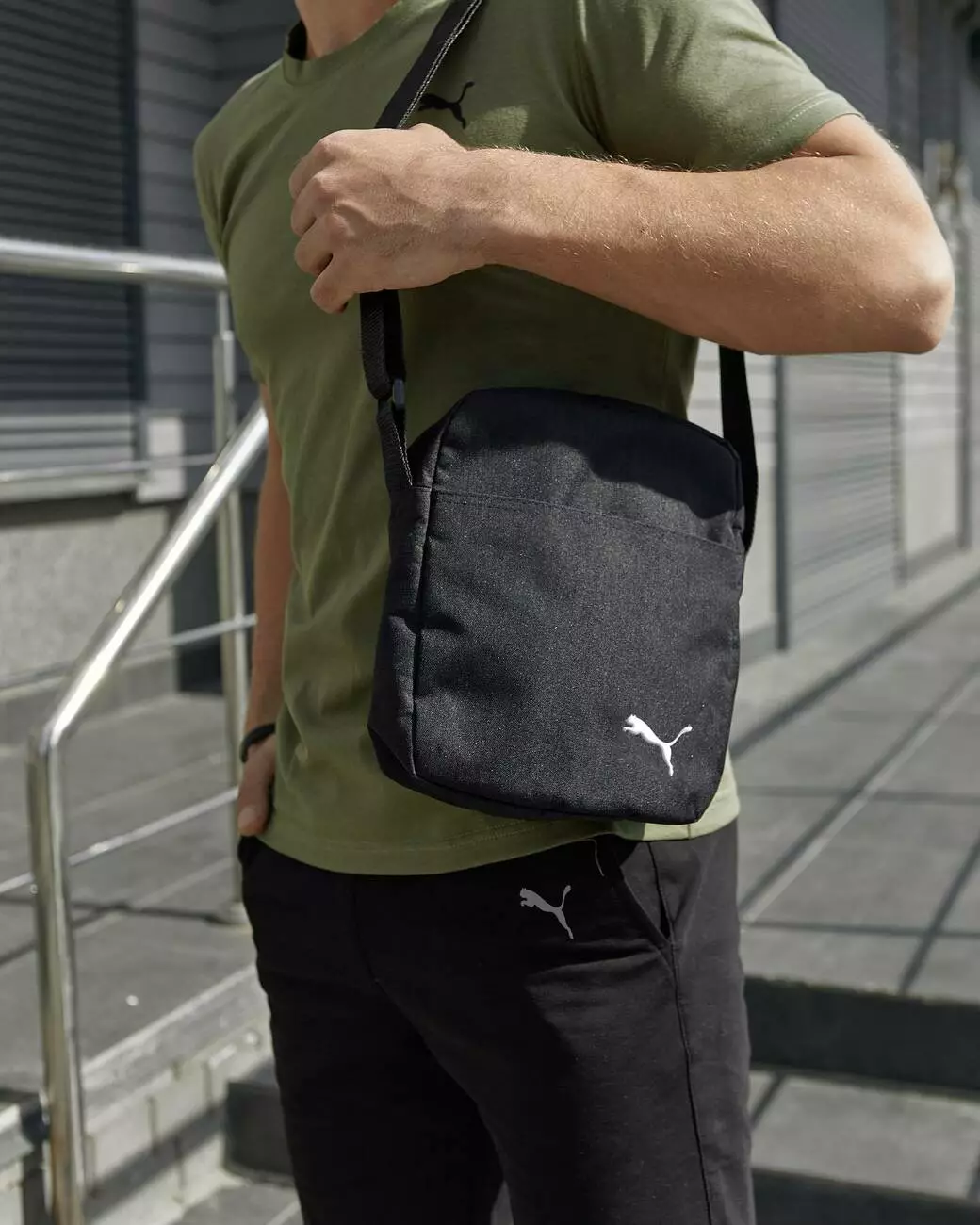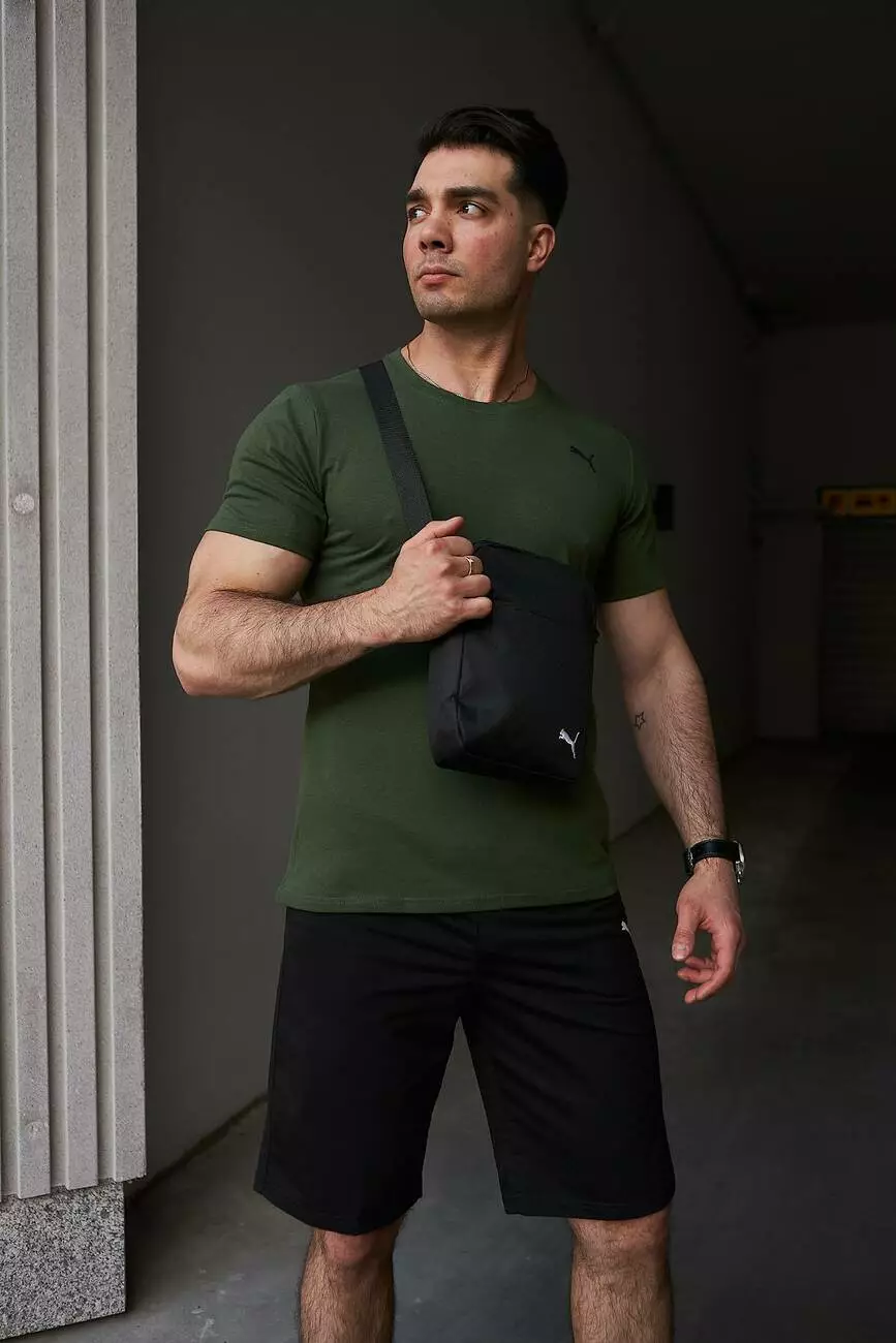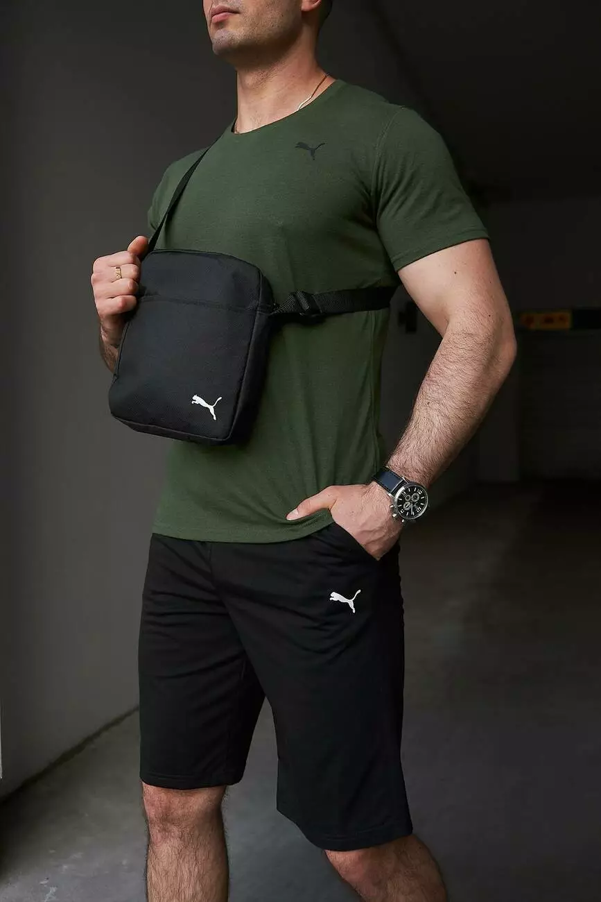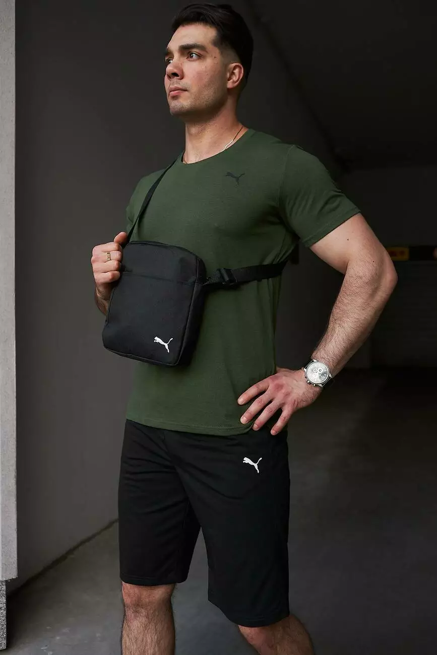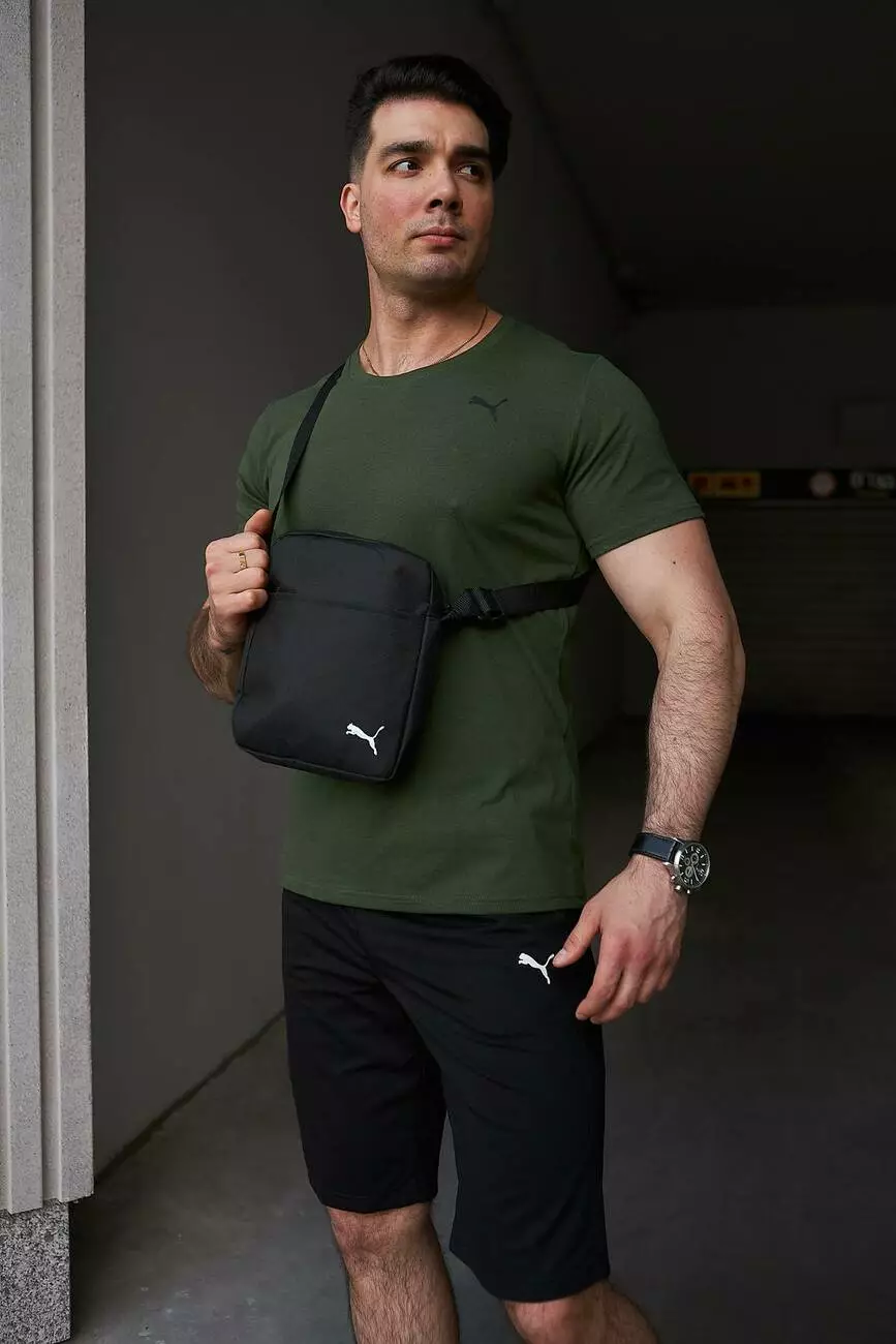 Комплект чоловічий Puma: футболка хакі + шорти чорні + барсетка чорна
