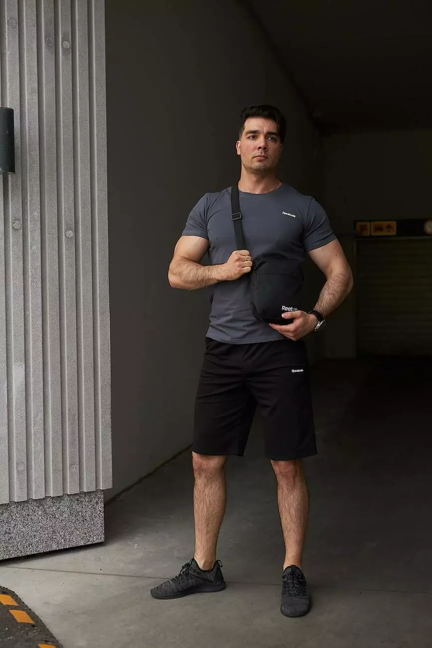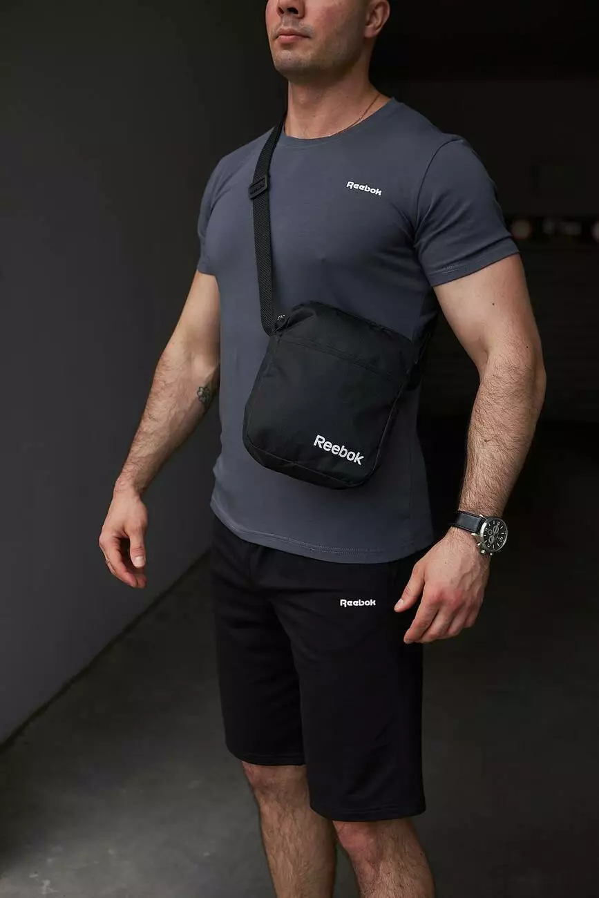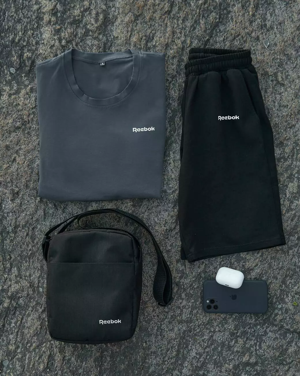 Комплект чоловічий Reebok: футболка темно-сіра + шорти чорні + барсетка чорна