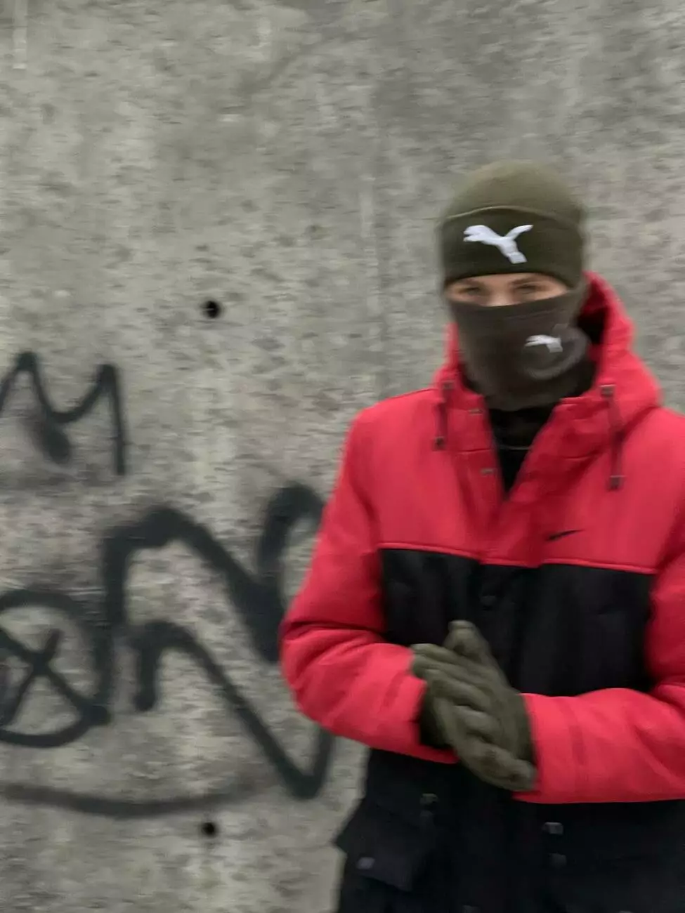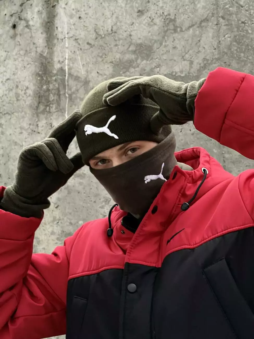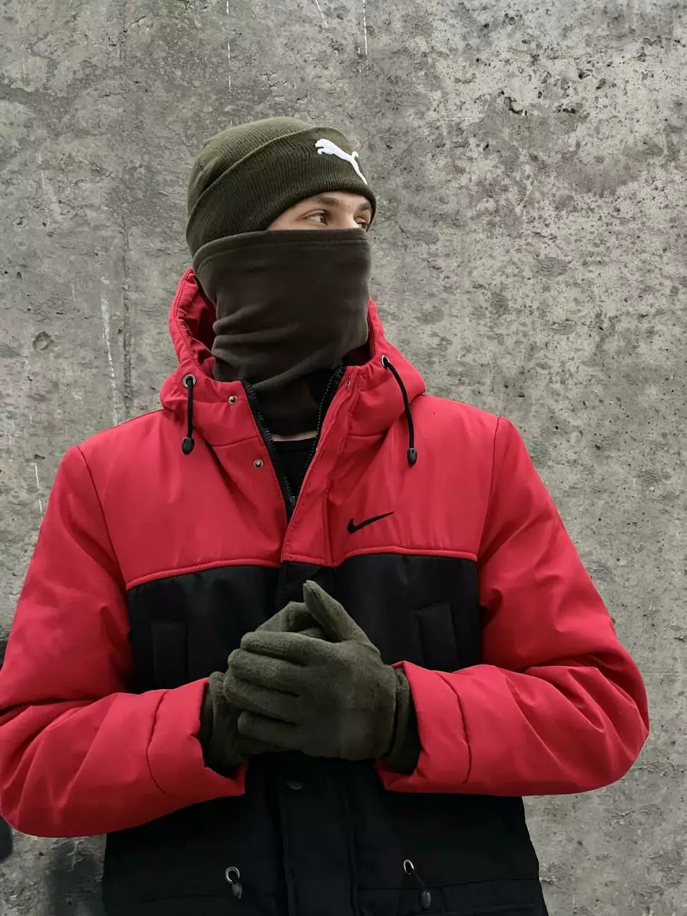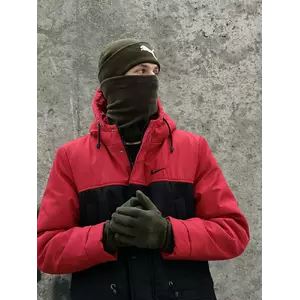 Комплект чоловічий: шапка з додаванням вовни Puma хакі + баф флісовий Puma хакі + рукавички флісові хакі