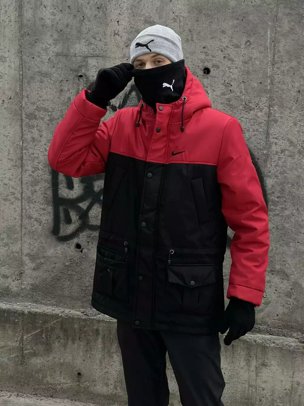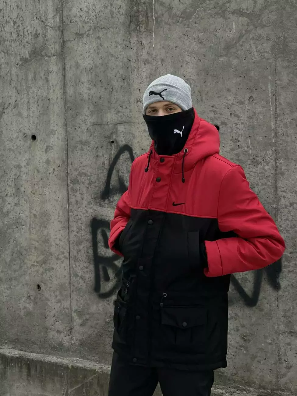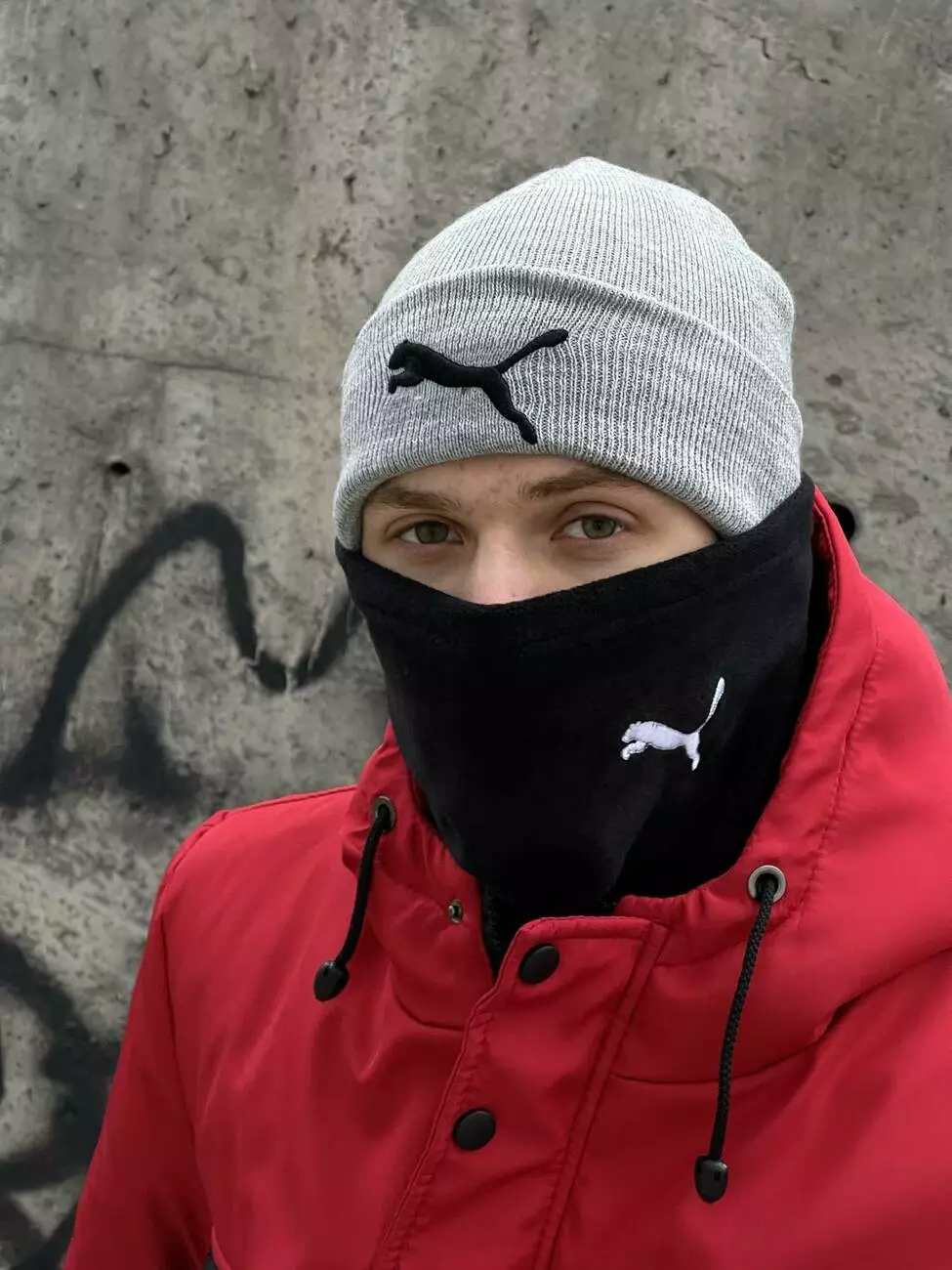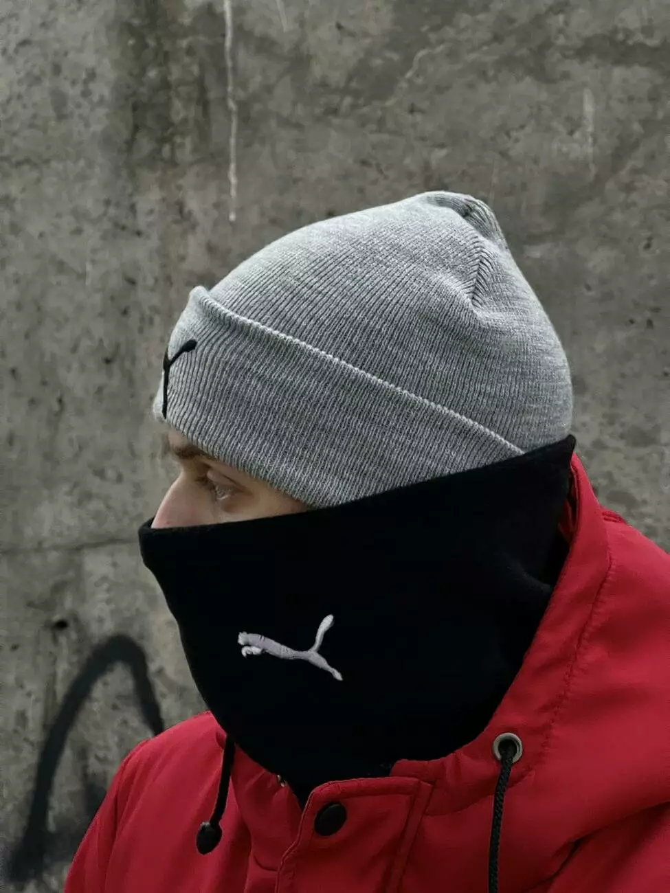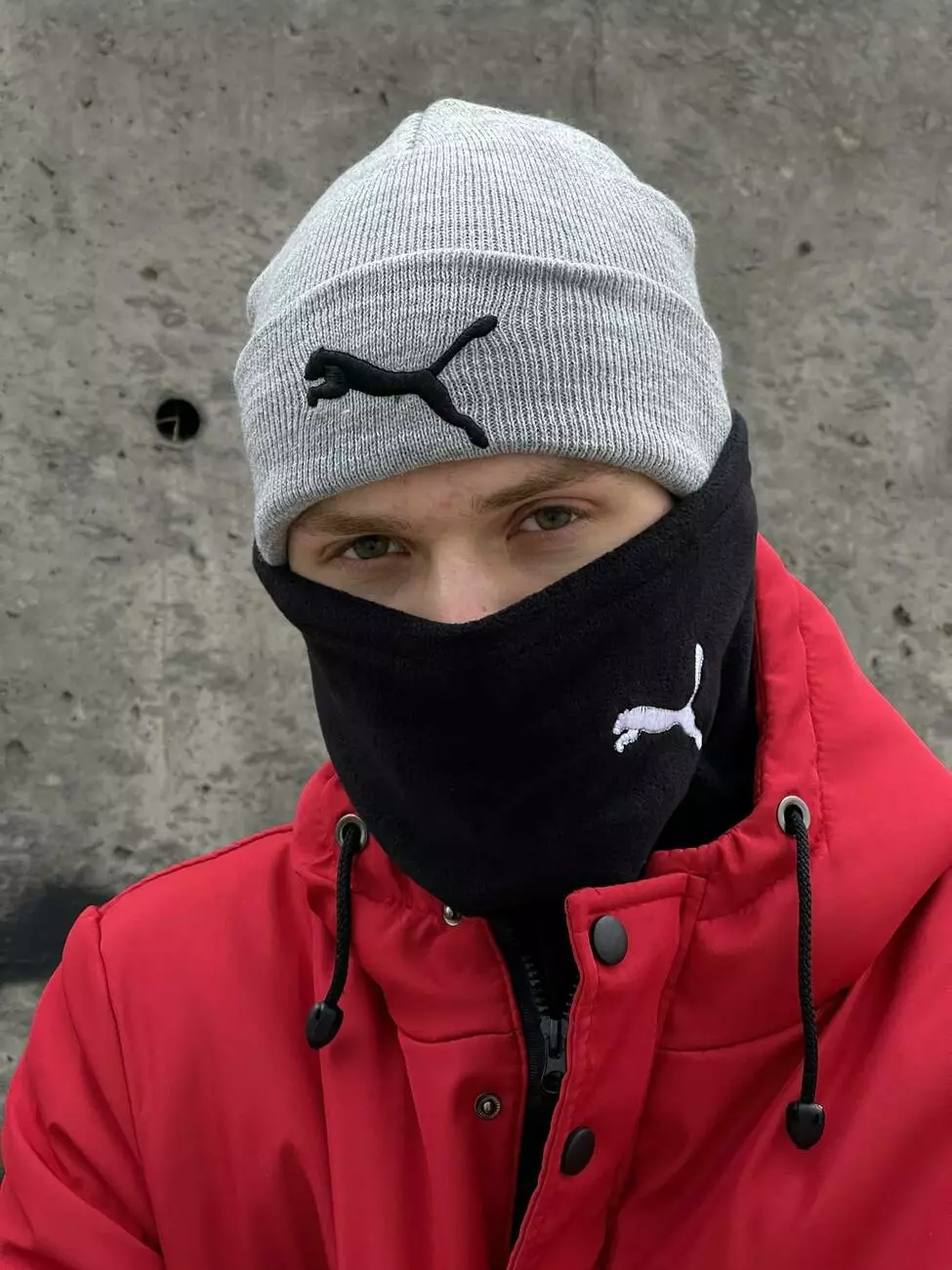 Комплект чоловічий: шапка з додаванням вовни Puma сірий меланж + баф флісовий Puma чорний + рукавички флісові чорні