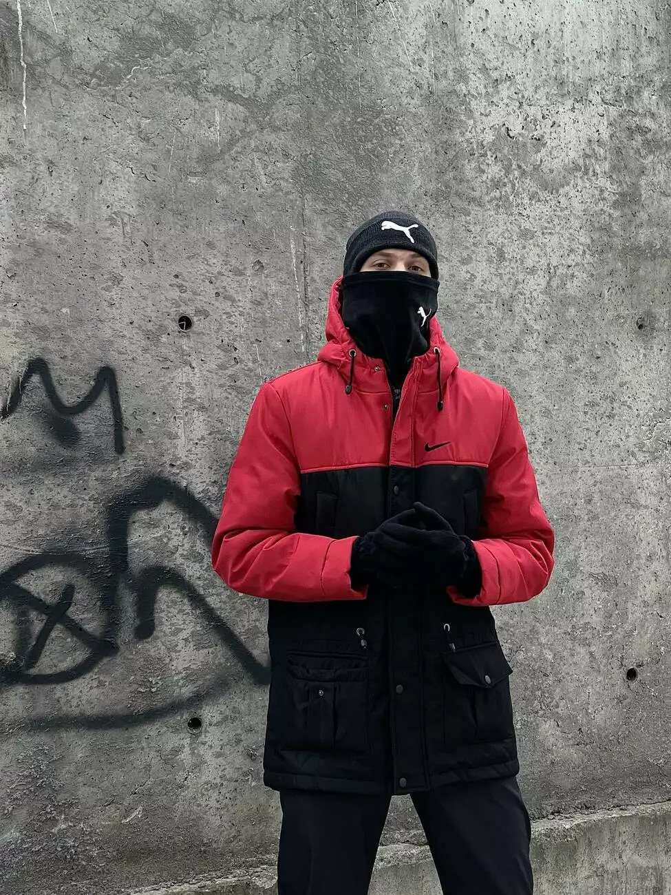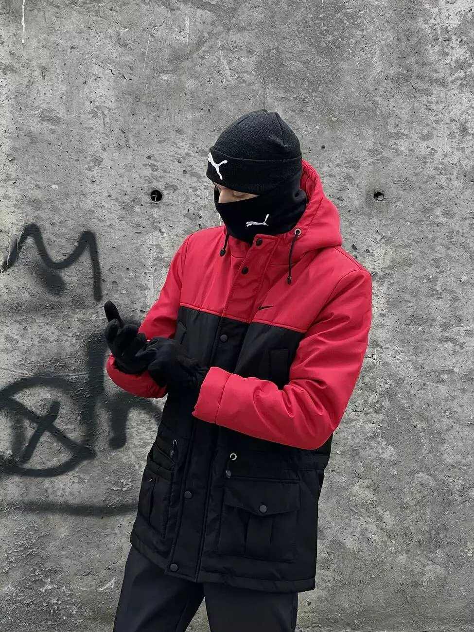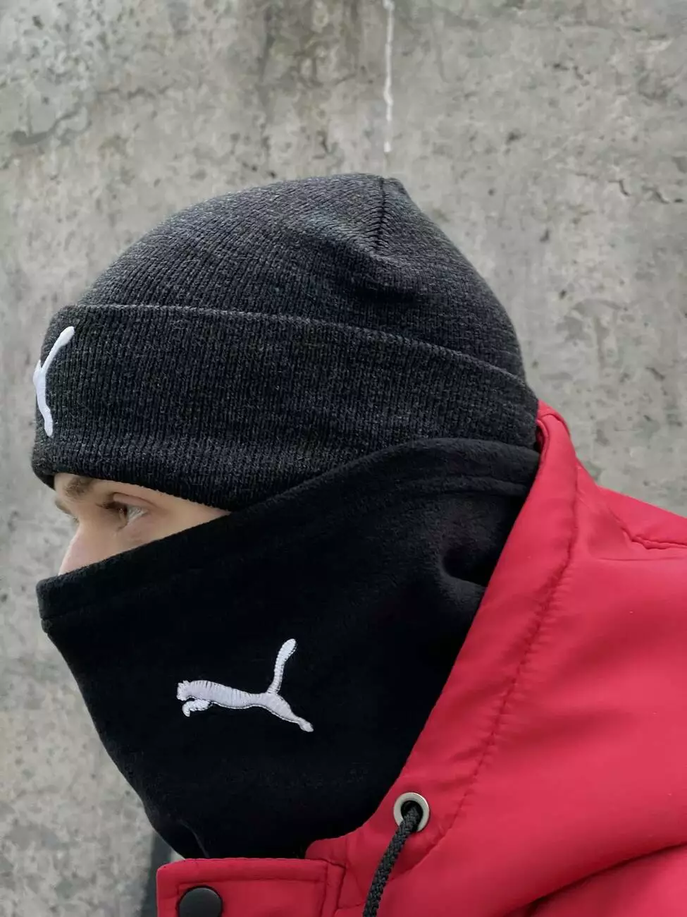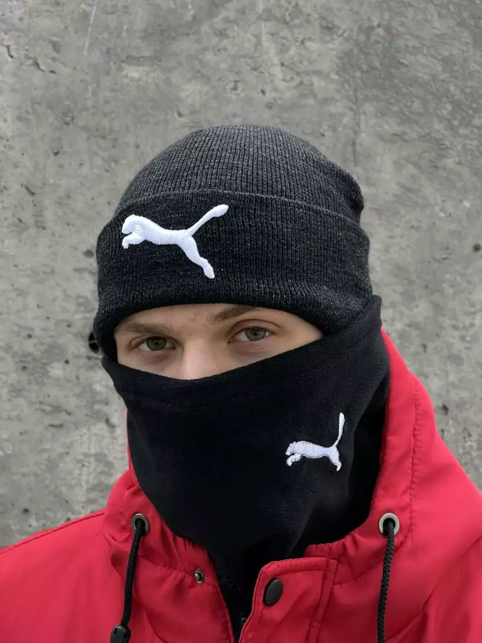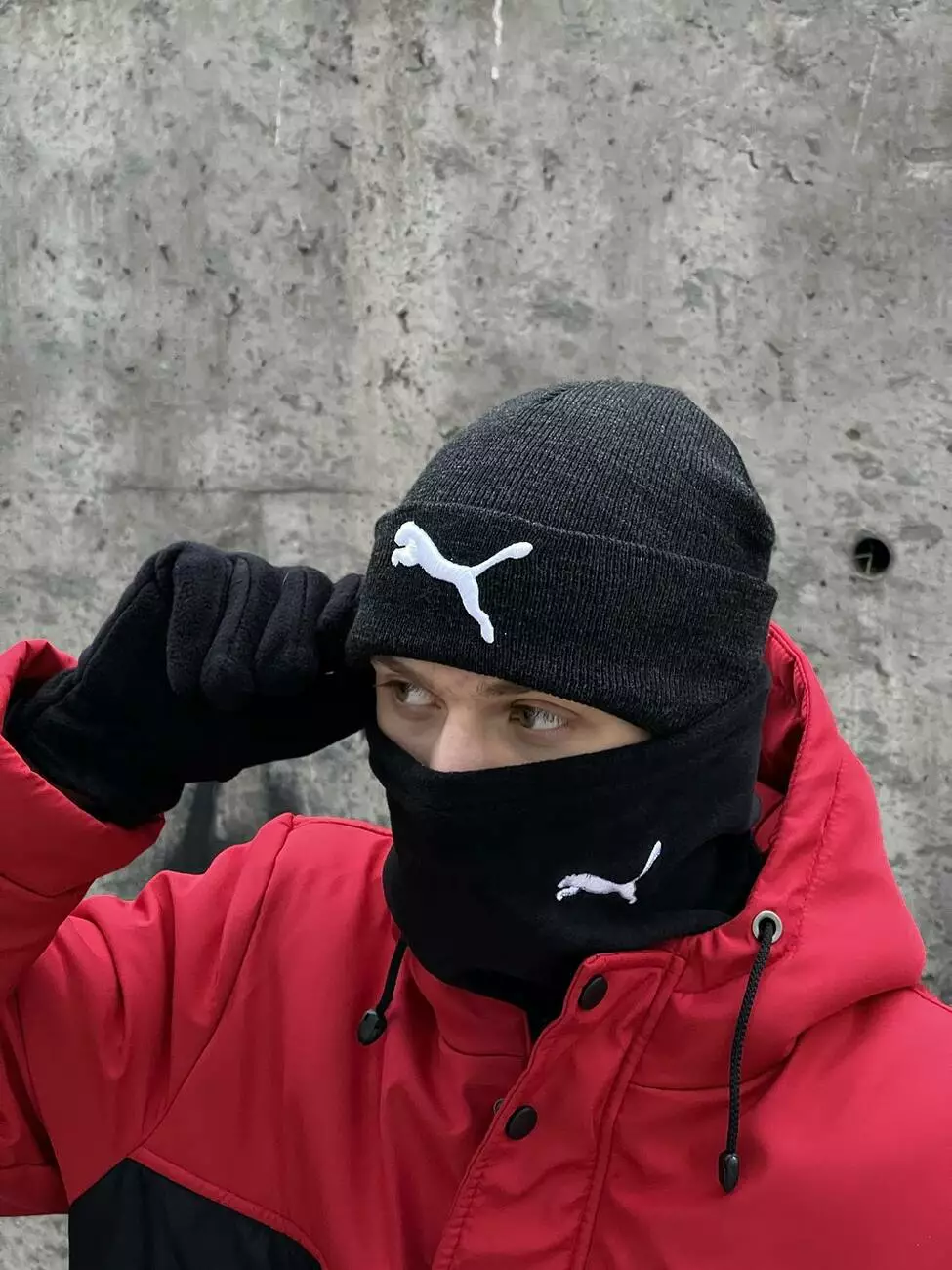 Комплект чоловічий: шапка з додаванням вовни Puma темно-сірий меланж + баф флісовий Puma чорний + рукавички флісові чорні