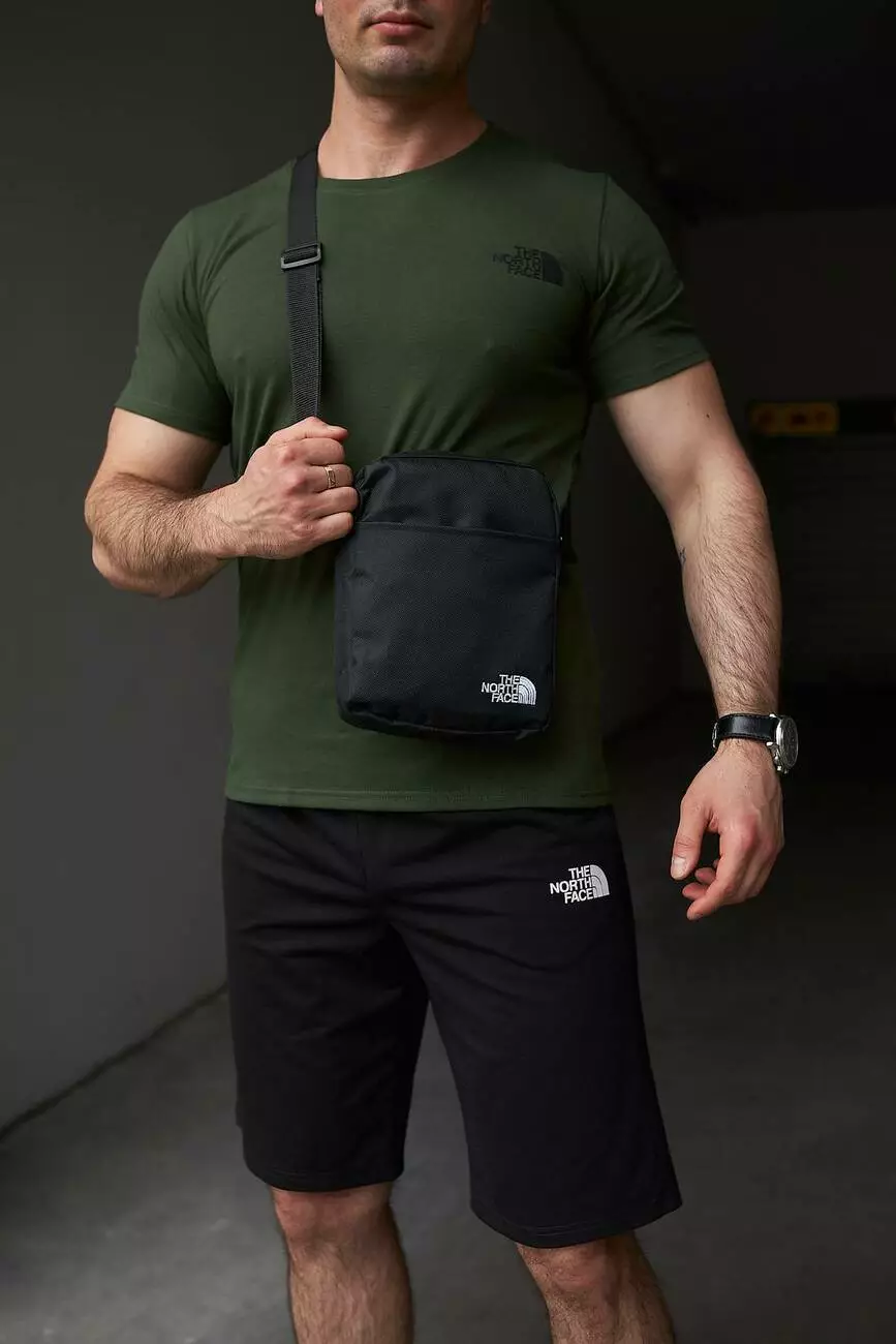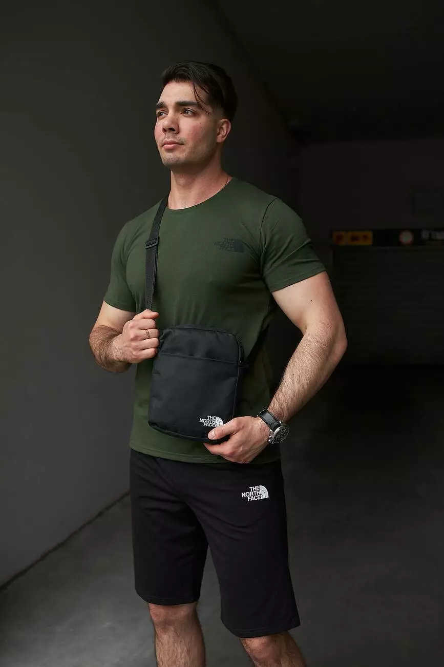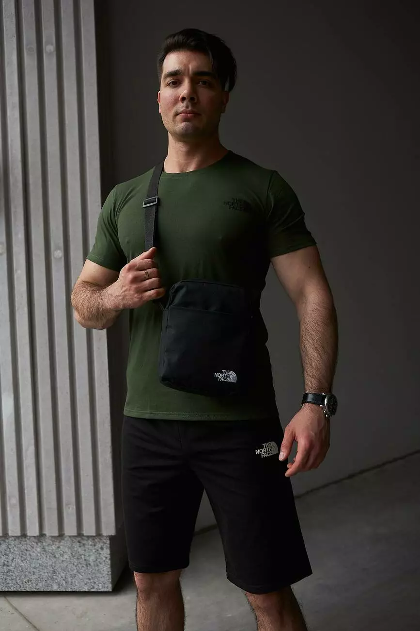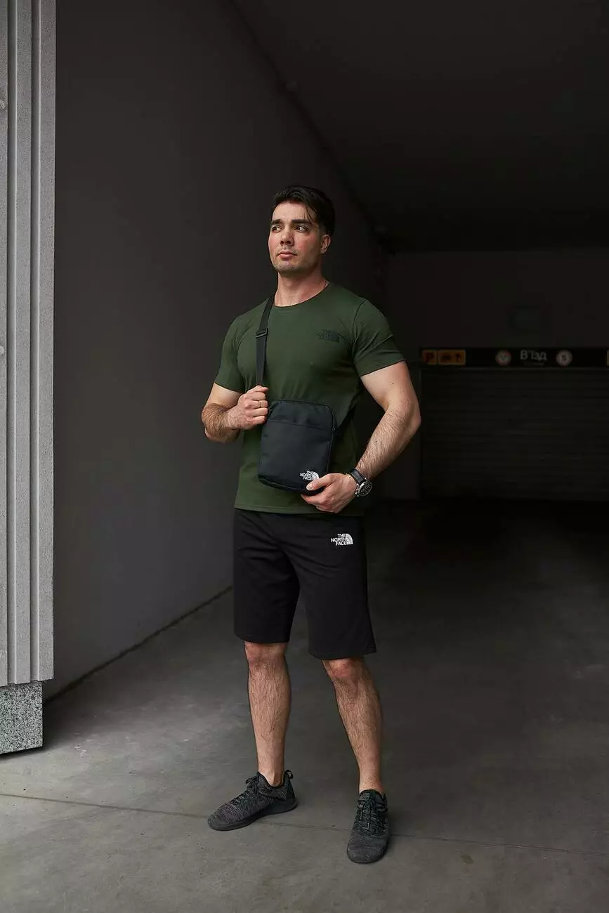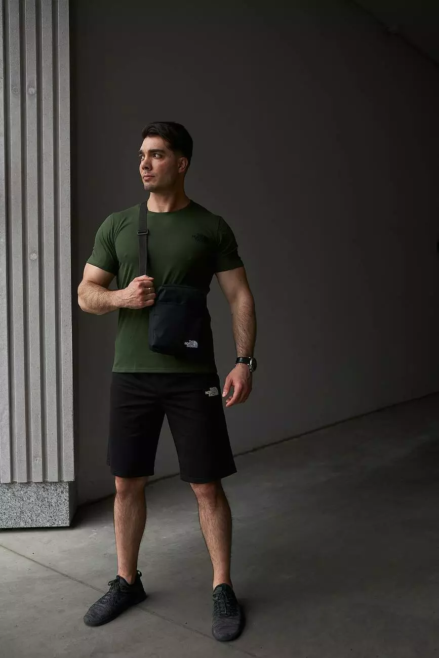 Комплект чоловічий TNF: футболка хакі + шорти чорні + барсетка чорна