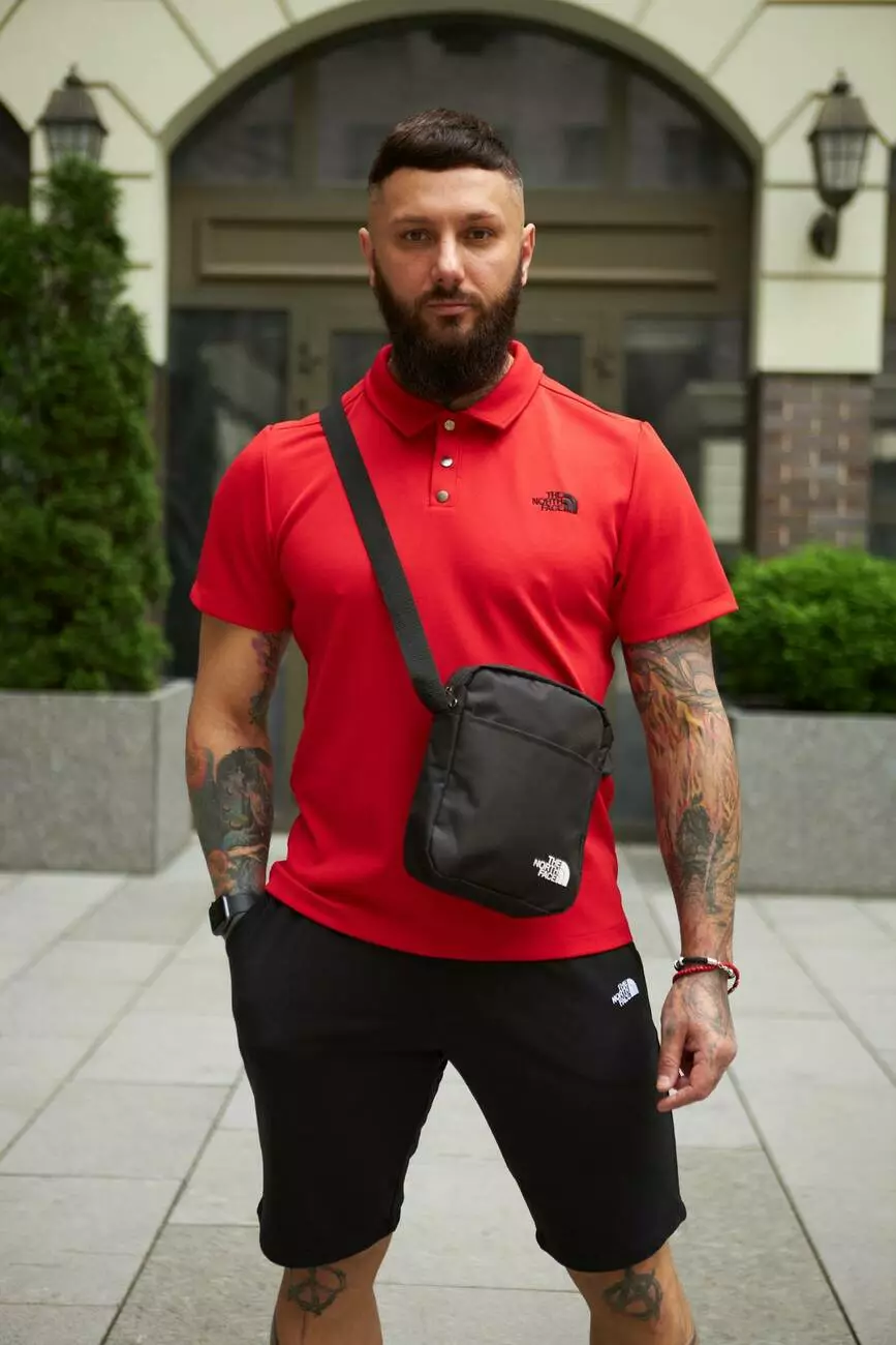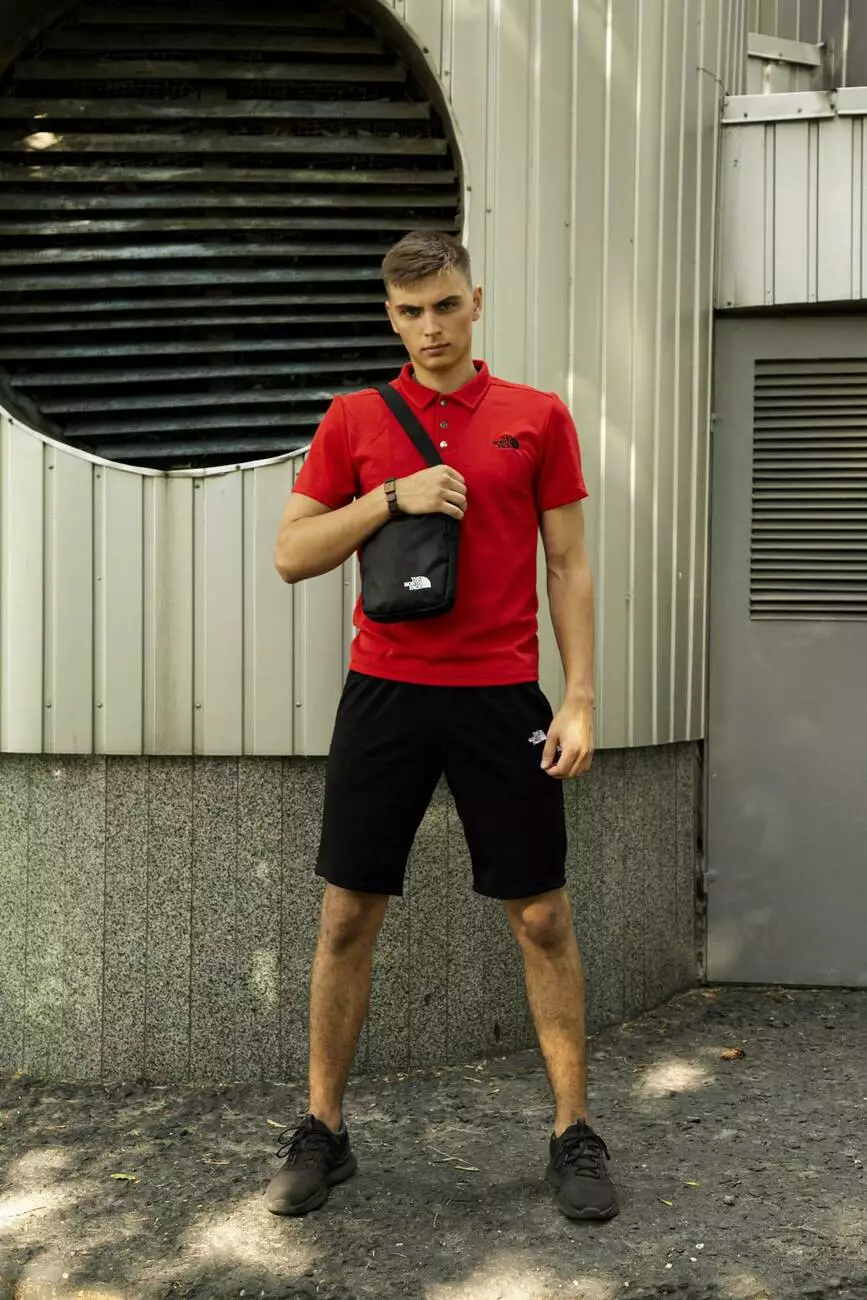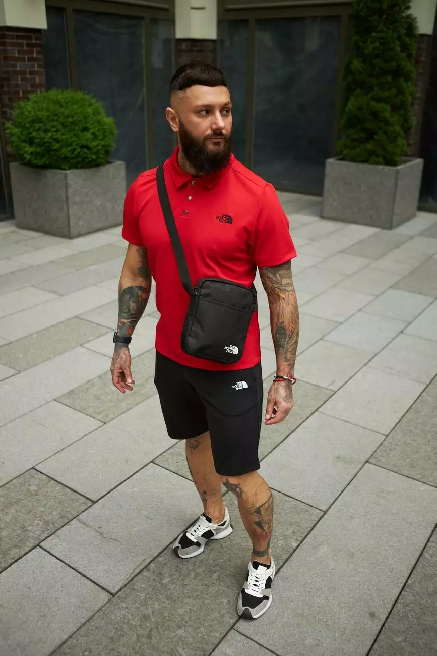 Комплект чоловічий TNF: поло червоне + шорти чорні + барсетка чорна