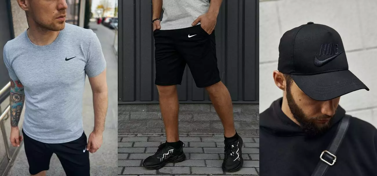 Комплект Nike футболка сіра + шорти + кепка Nike чорна / чорне лого і напис