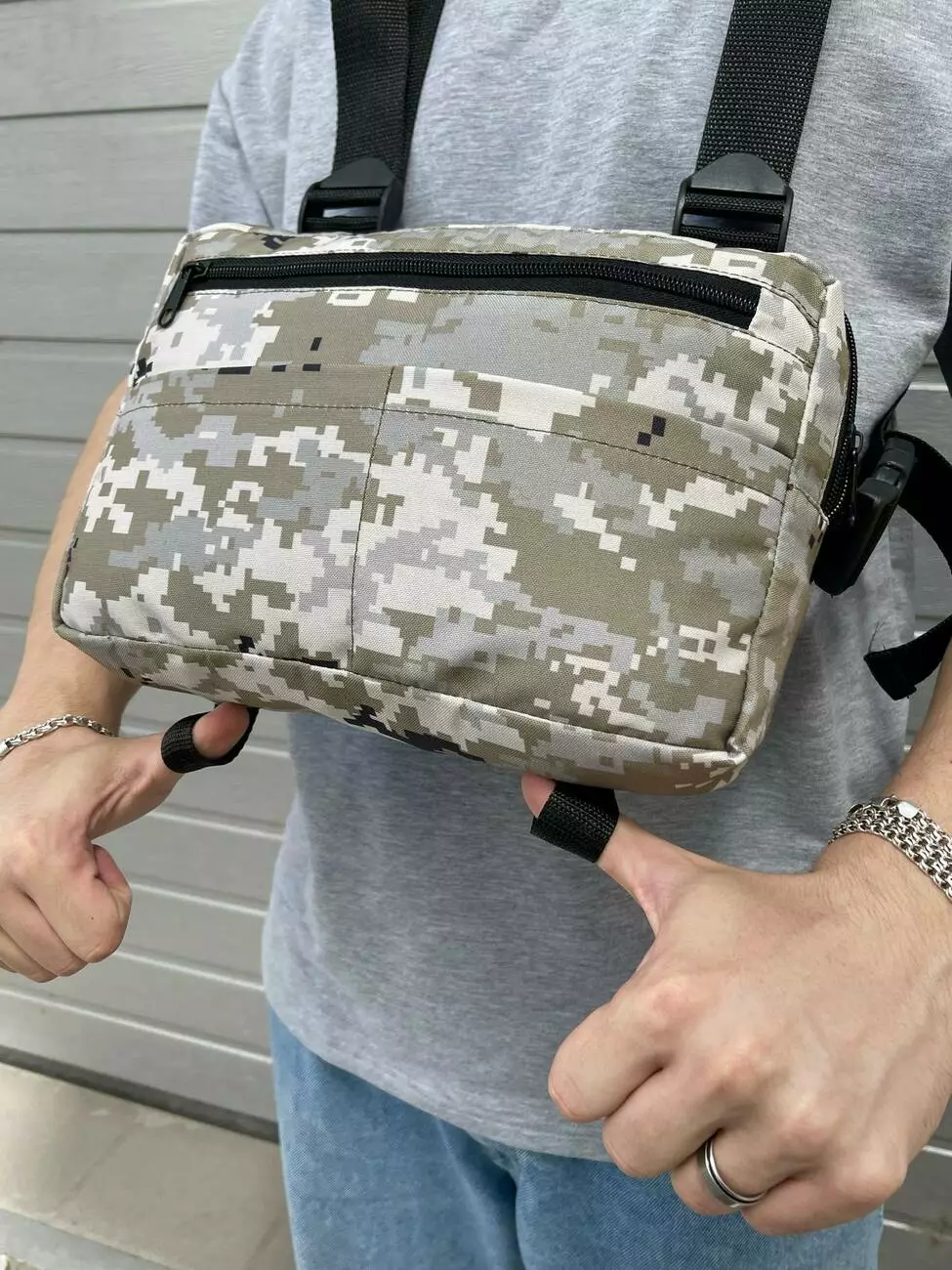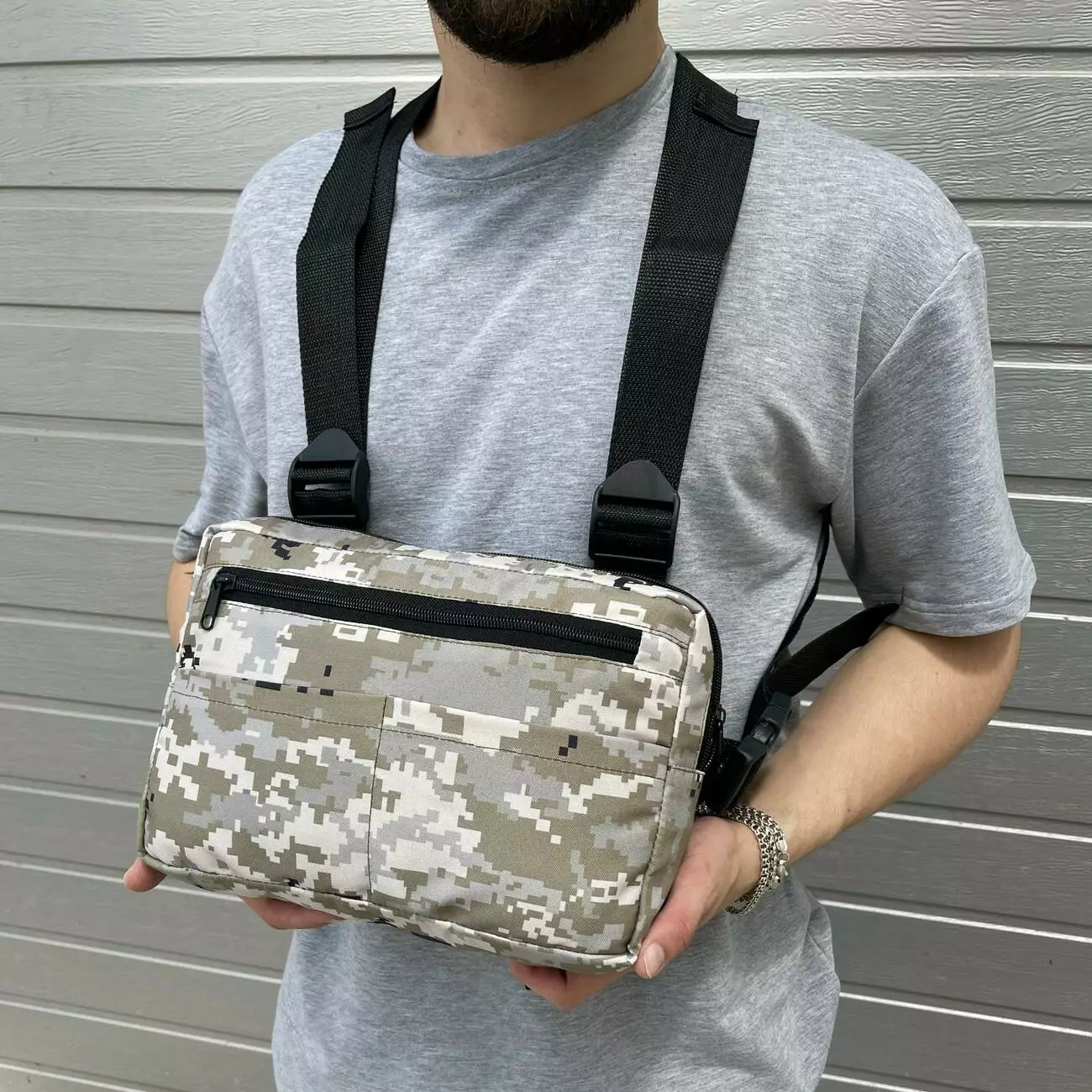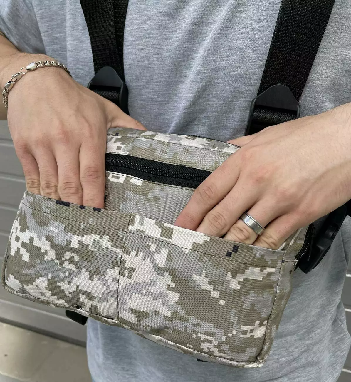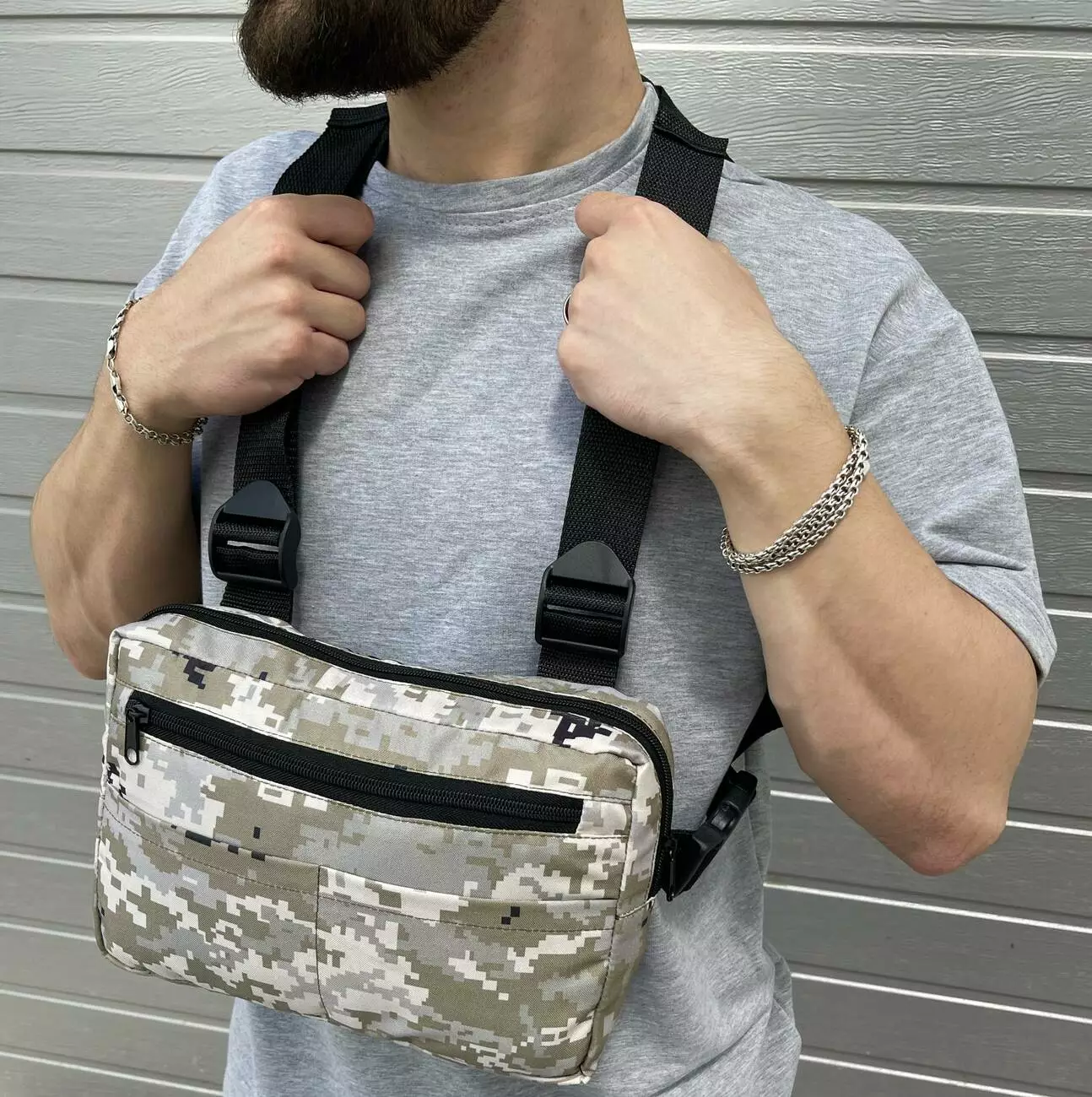 Чудова нагрудна сумка, яка замінить Вам невеликий рюкзак! Вміщує достатню кількість речей: від ключів і документів до планшета/нетбука. Підійде як для носіння на вулиці, так і для професійних робітників, яким, в силу своєї професії, потрібно постійно мати під рукою безліч невеликих, не дуже важких інструментів. Наприклад, художникам ;)