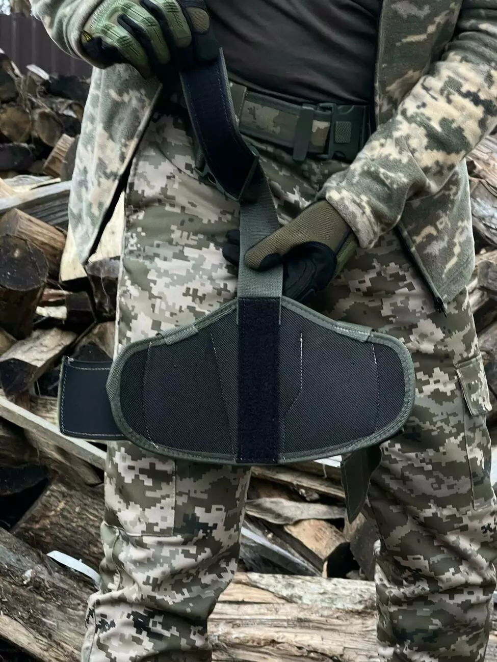 - К поясу крепится с помощью ремня на быстросъемнике с возможностью регулировки ремня по длине..