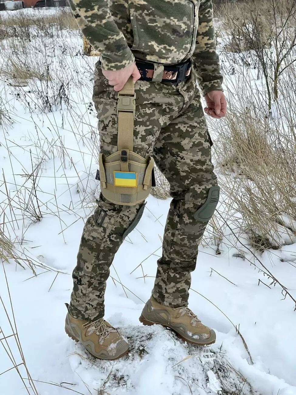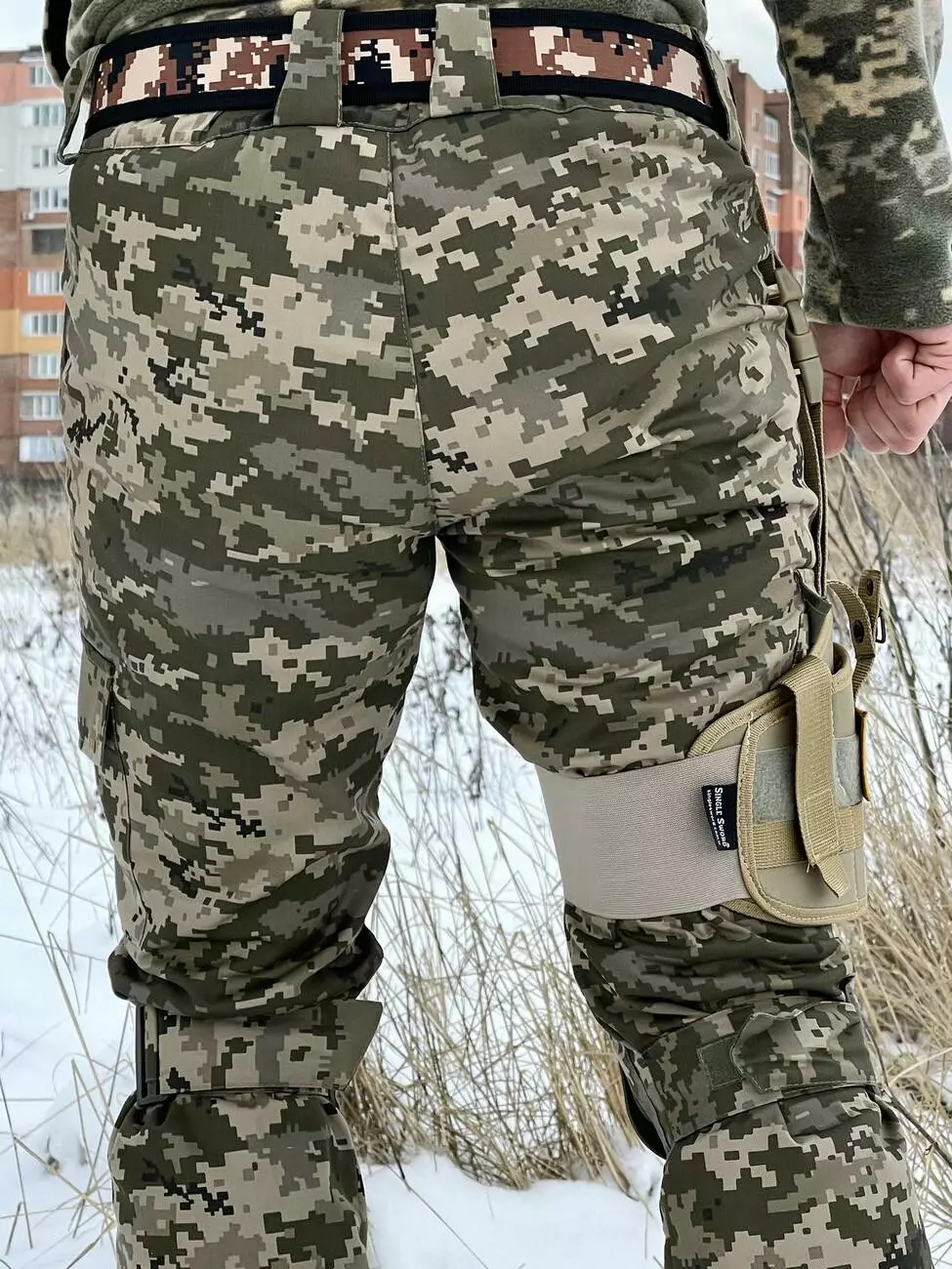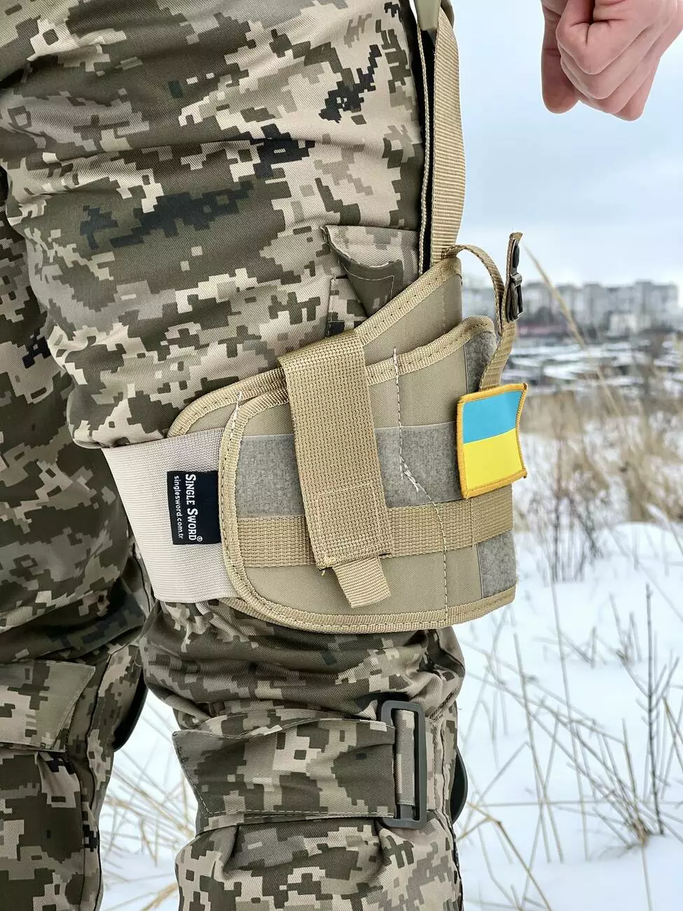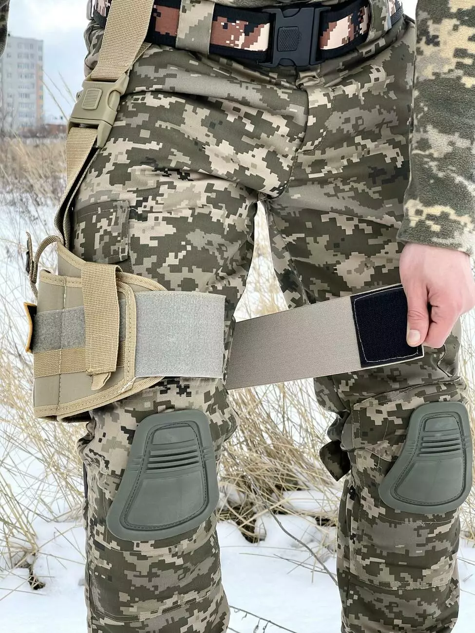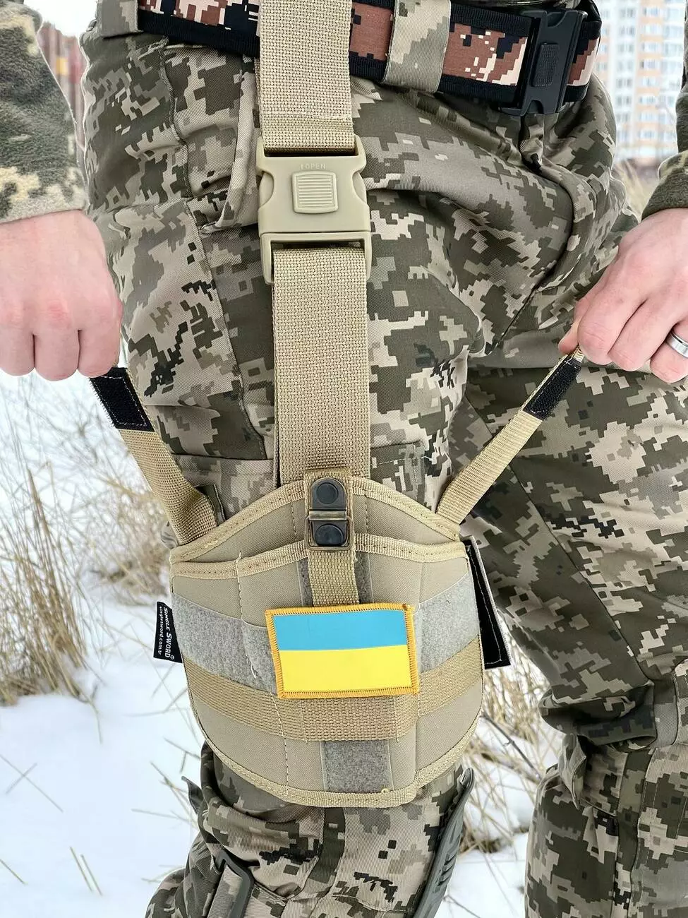 - До пояса кріпиться за допомогою ременя на швидкознімач з можливістю регулювання ременя по довжині.