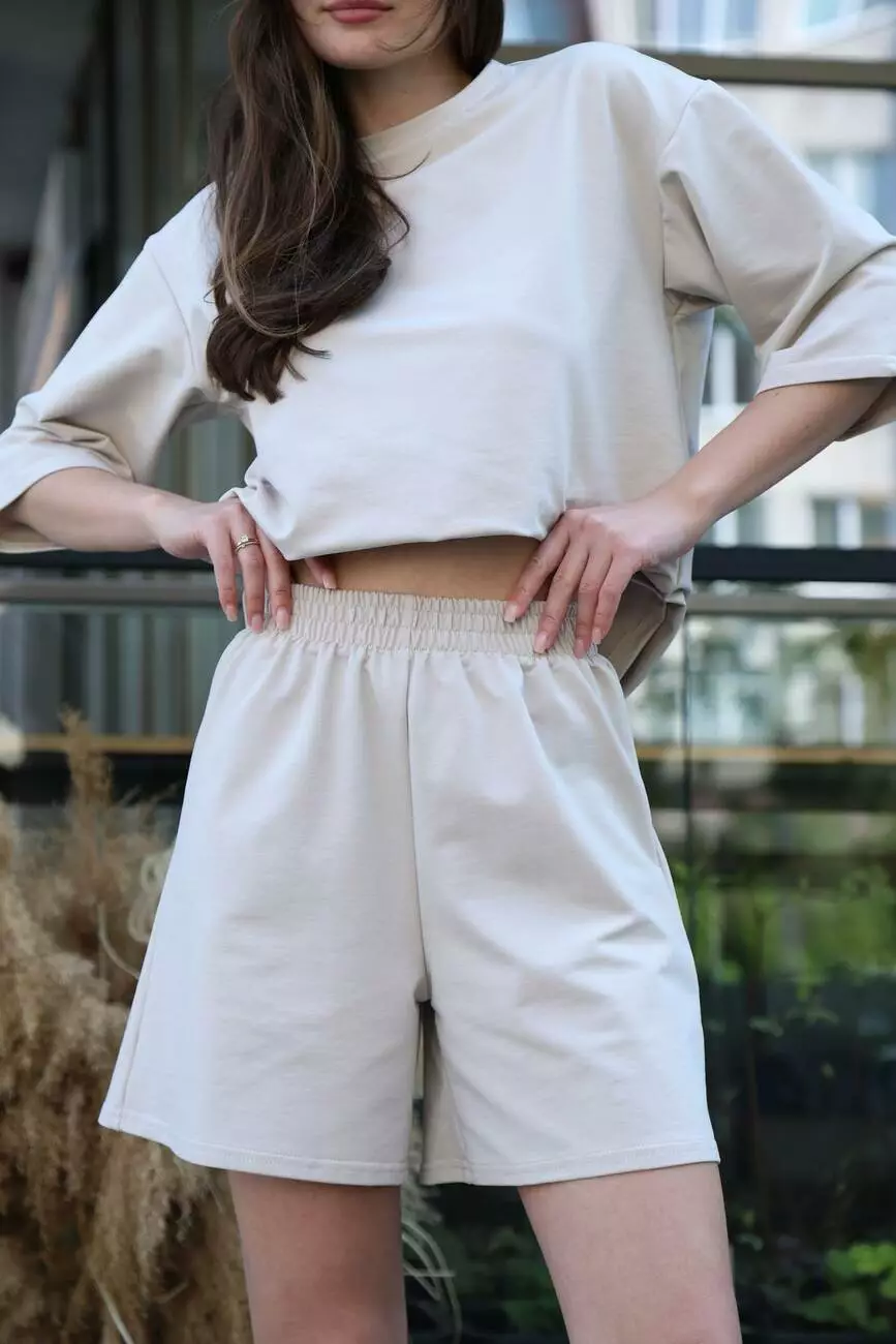 Шорти — трапецієподібного силуету, на м’якому еластичному поясі.