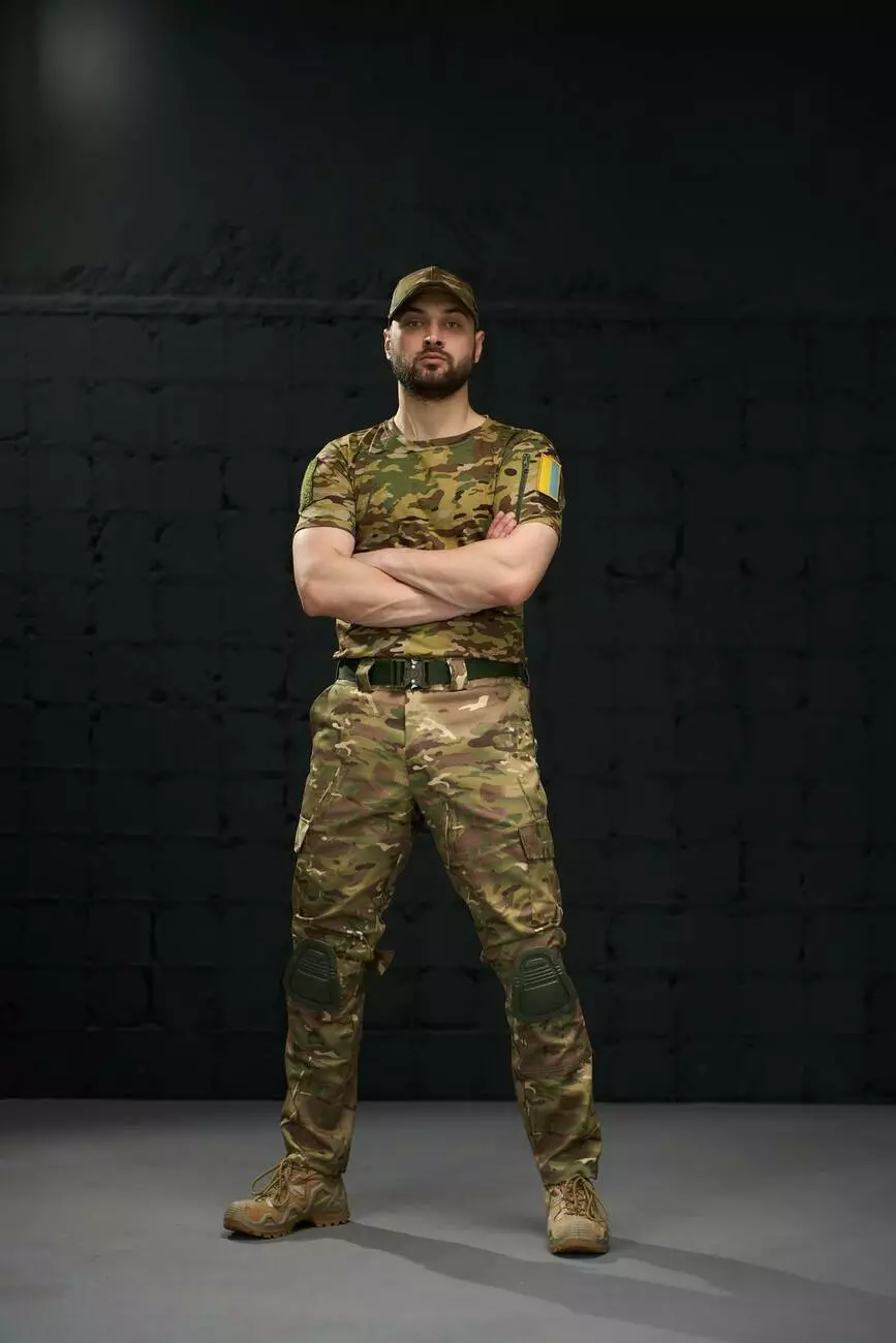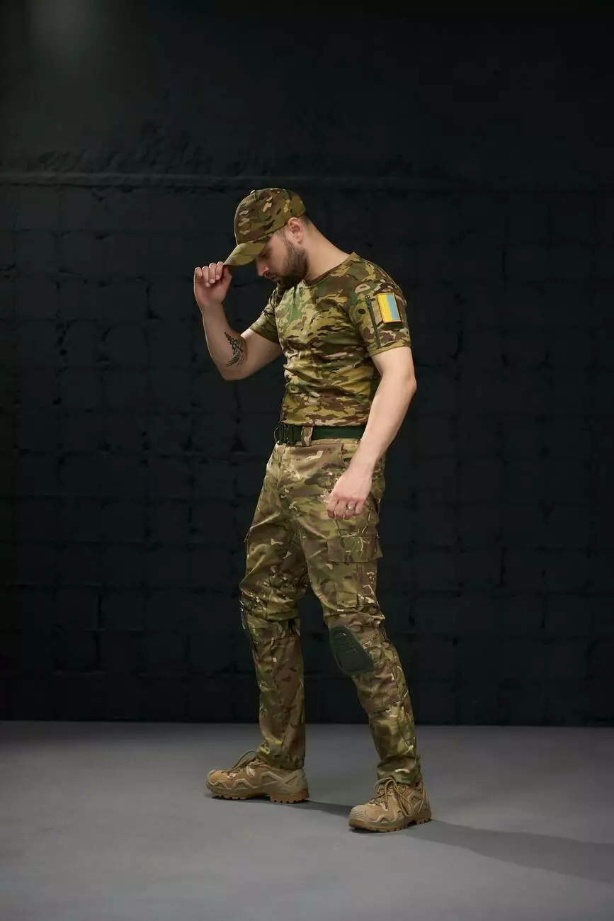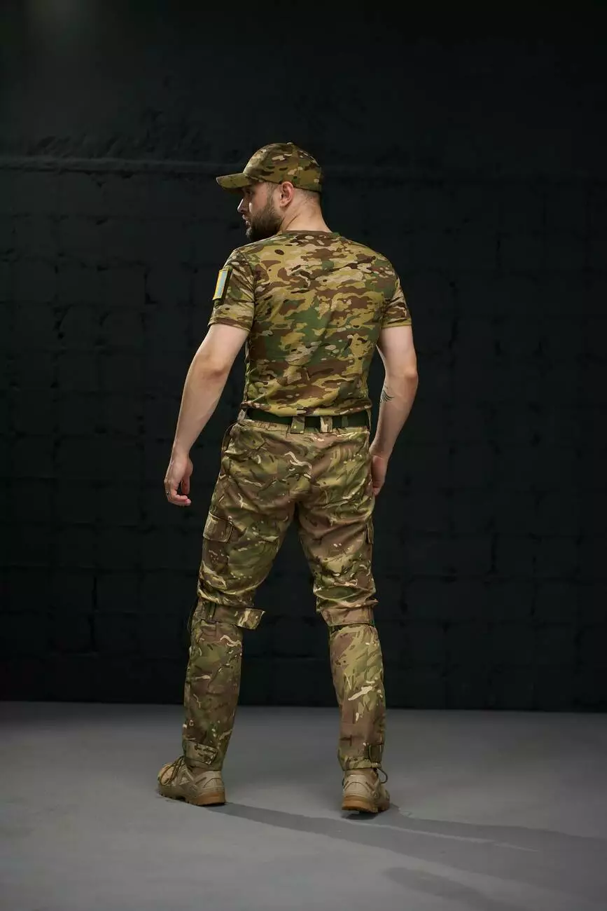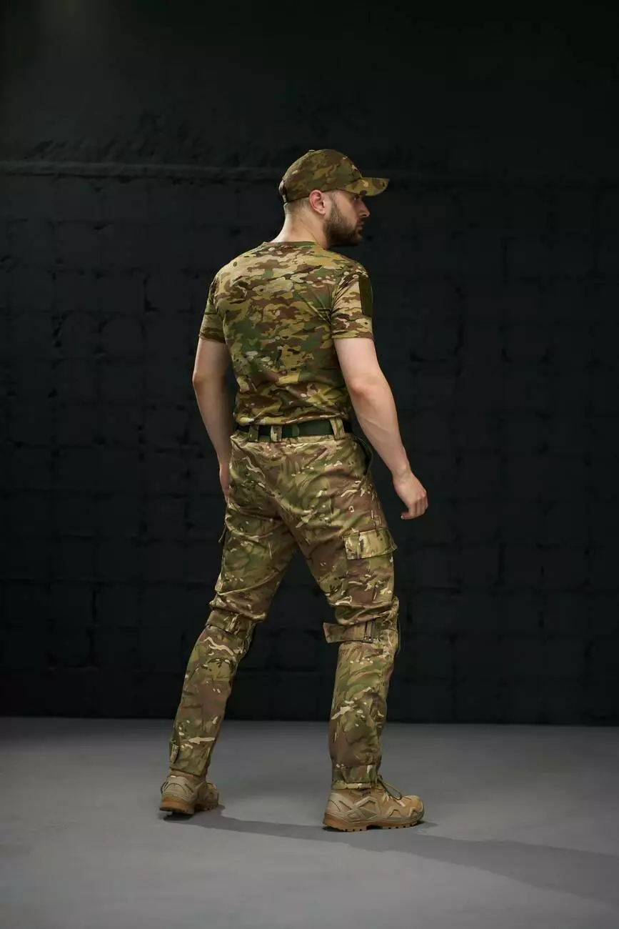 Штани Protect мультикам + Футболка мультикам з липучками на плечах та кишенею на блискавці + Кепка мультикам + Ремінь хакі