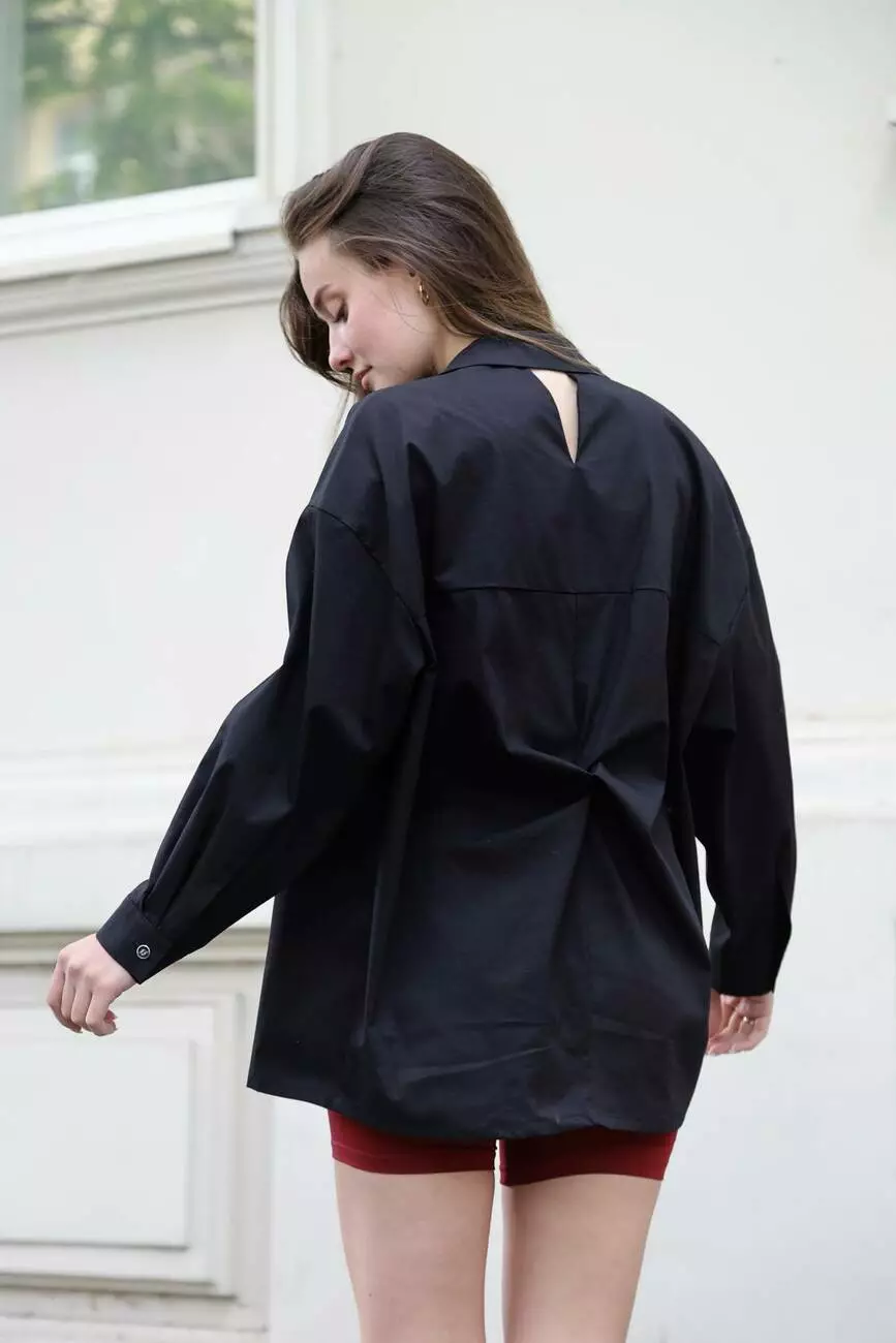 Легка, стильна та небанальна — ця сорочка додає образу динаміки завдяки декоративній складці на спинці, що нагадує вихор.