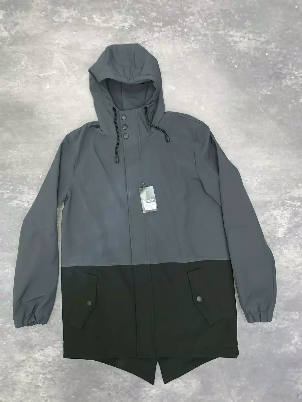 - Капюшон вшитий, не знімний, регулюється шнурком із пластиковим фіксатором;