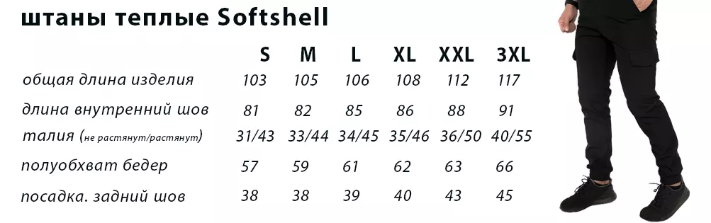 - Матеріал - Softshell (матеріал, що заслужив світову популярність не тільки у любителів активного відпочинку, але й у тих, хто цінує комфорт та високі експлуатаційні характеристики в найнепередбачуванішу погоду.) За рахунок комбінації матеріалів та практичного крою, штани добре зберігають тепло і не пропускають вологу ззовні.