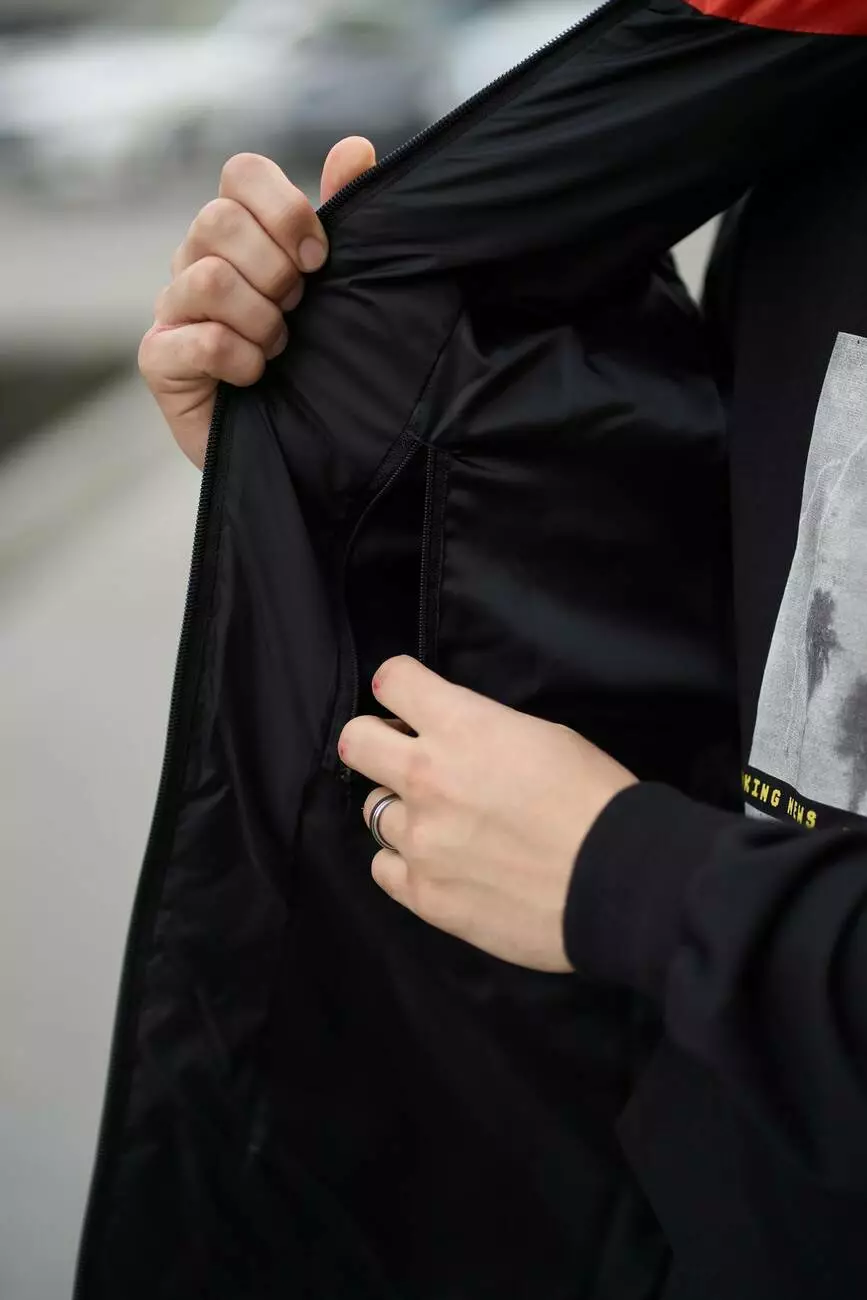Жилетка має прямий вільний крій. Каптуру немає, зате є дві прорізні стандартні кишені і одна внутрішня. Усі кишені на змійці.