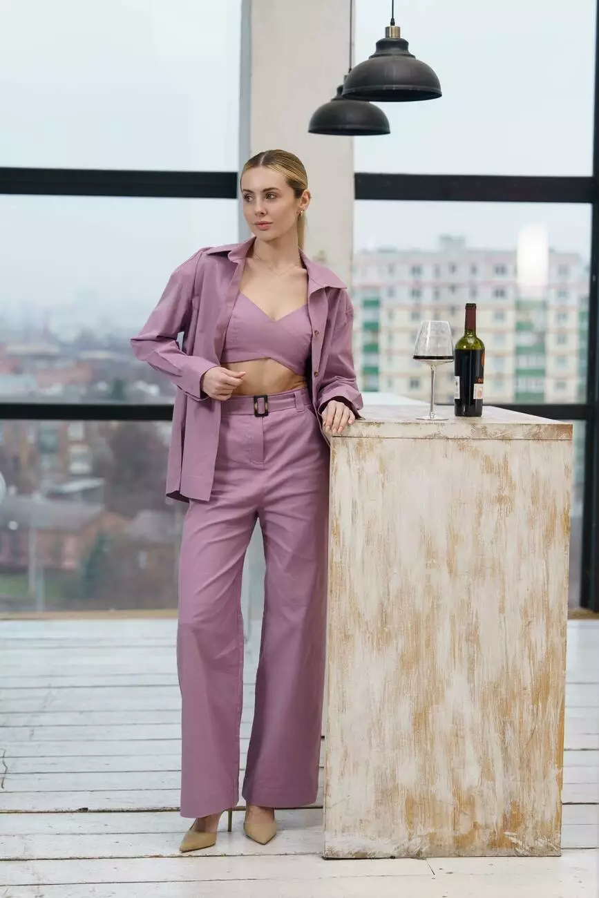 Костюм виготовлений із високоякісного льону (95%) з додаванням еластану (5%). Натуральний льон забезпечує легкість та повітропроникність, а еластан додає трохи еластичності для ідеальної посадки. У такому вбранні вам буде комфортно навіть у спекотний день!