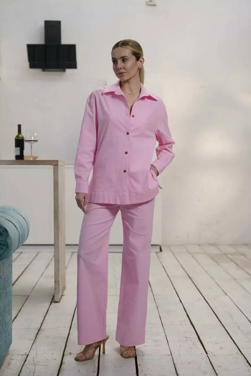 Костюм виготовлений із високоякісного льону (95%) з додаванням еластану (5%). Натуральний льон забезпечує легкість та повітропроникність, а еластан додає трохи еластичності для ідеальної посадки. У такому вбранні вам буде комфортно навіть у спекотний день!